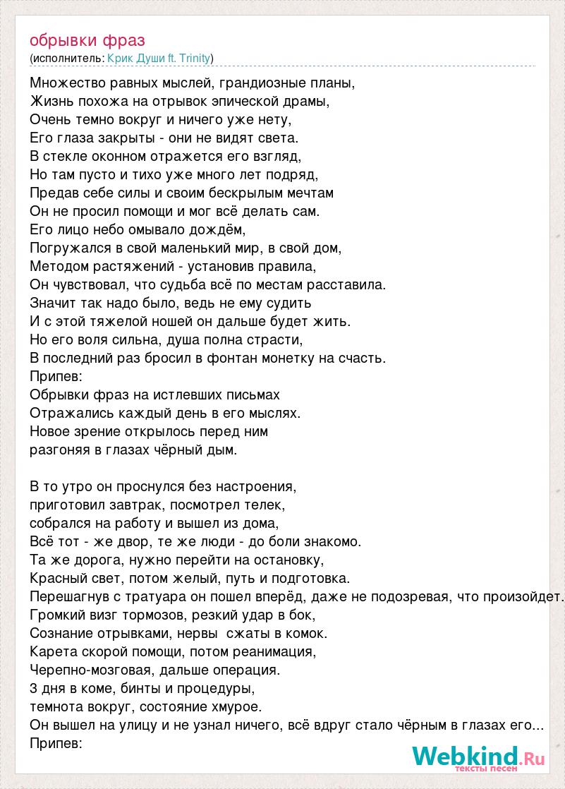 Множество равных мыслей, грандиозные планы, Жизнь похожа на отрывок эпической драмы, Очень темно вокруг и ничего уже нету, Его глаза закрыты - они не видят света. В стекле оконном отражется его взгляд, Но там пусто и тихо уже много лет подряд, Предав себе силы и своим бескрылым мечтам Он не просил помощи и мог всё делать сам. Его лицо небо омывало дождём, Погружался в свой маленький мир, в свой дом, Методом растяжений - установив правила, Он чувствовал, что судьба всё по местам расставила. Значит так надо было, ведь не ему судить И с этой тяжелой ношей он дальше будет жить. Но его воля сильна, душа полна страсти, В последний раз бросил в фонтан монетку на счасть. Припев: Обрывки фраз на истлевших письмах Отражались каждый день в его мыслях. Новое зрение открылось перед ним разгоняя в глазах чёрный дым. В то утро он проснулся без настроения, приготовил завтрак, посмотрел телек, собрался на работу и вышел из дома, Всё тот - же двор, те же люди - до боли знакомо. Та же дорога, нужно перейти на остановку, Красный свет, потом желый, путь и подготовка. Перешагнув с тратуара он пошел вперёд, даже не подозревая, что произойдет. Громкий визг тормозов, резкий удар в бок, Сознание отрывками, нервы сжаты в комок. Карета скорой помощи, потом реанимация, Черепно-мозговая, дальше операция. 3 дня в коме, бинты и процедуры, темнота вокруг, состояние хмурое. Он вышел на улицу и не узнал ничего, всё вдруг стало чёрным в глазах его... Припев: