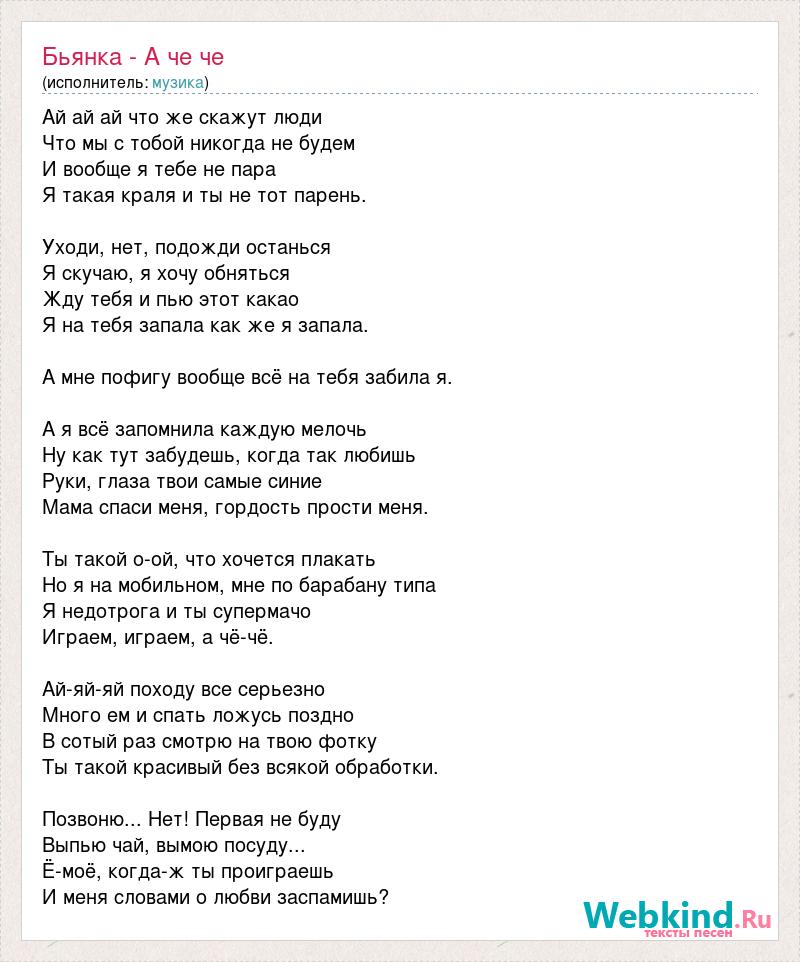 Ай ай ай что же скажут люди Что мы с тобой никогда не будем И вообще я тебе не пара Я такая краля и ты не тот парень. Уходи, нет, подожди останься Я скучаю, я хочу обняться Жду тебя и пью этот какао Я на тебя запала как же я запала. А мне пофигу вообще всё на тебя забила я. А я всё запомнила каждую мелочь Ну как тут забудешь, когда так любишь Руки, глаза твои самые синие Мама спаси меня, гордость прости меня. Ты такой о-ой, что хочется плакать Но я на мобильном, мне по барабану типа Я недотрога и ты супермачо Играем, играем, а чё-чё. Ай-яй-яй походу все серьезно Много ем и спать ложусь поздно В сотый раз смотрю на твою фотку Ты такой красивый без всякой обработки. Позвоню... Нет! Первая не буду Выпью чай, вымою посуду... Ё-моё, когда-ж ты проиграешь И меня словами о любви заспамишь?