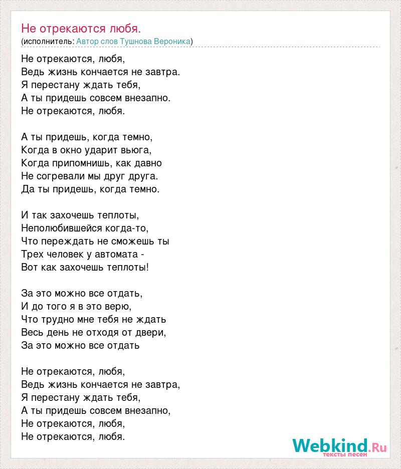 Не отрекаются, любя, Ведь жизнь кончается не завтра. Я перестану ждать тебя, А ты придешь совсем внезапно. Не отрекаются, любя. А ты придешь, когда темно, Когда в окно ударит вьюга, Когда припомнишь, как давно Не согревали мы друг друга. Да ты придешь, когда темно. И так захочешь теплоты, Неполюбившейся когда-то, Что переждать не сможешь ты Трех человек у автомата - Вот как захочешь теплоты! За это можно все отдать, И до того я в это верю, Что трудно мне тебя не ждать Весь день не отходя от двери, За это можно все отдать Не отрекаются, любя, Ведь жизнь кончается не завтра, Я перестану ждать тебя, А ты придешь совсем внезапно, Не отрекаются, любя, Не отрекаются, любя.