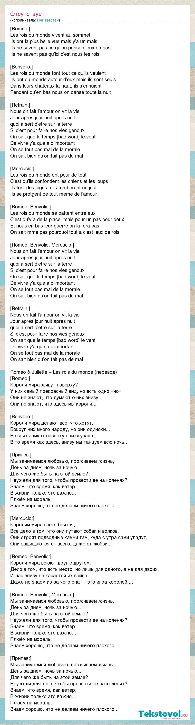[Romeo:] Les rois du monde vivent au sommet Ils ont la plus belle vue mais y’a un mais Ils ne savent pas ce qu’on pense d’eux en bas Ils ne savent pas qu’ici c’est nous les rois [Benvolio:] Les rois du monde font tout ce qu’ils veulent Ils ont du monde autour d’eux mais ils sont seuls Dans leurs chateaux la-haut, ils s’ennuient Pendant qu’en bas nous on danse toute la nuit [Refrain:] Nous on fait l’amour on vit la vie Jour apres jour nuit apres nuit quoi a sert d’etre sur la terre Si c’est pour faire nos vies genoux On sait que le temps c’est comme le vent De vivre y’a que a d’important On se fout pas mal de la morale On sait bien qu’on fait pas de mal [Mercucio:] Les rois du monde ont peur de tout C’est qu’ils confondent les chiens et les loups Ils font des piges o ils tomberont un jour Ils se protgent de tout meme de l’amour [Romeo, Benvolio:] Les rois du monde se battent entre eux C’est qu’y a de la place, mais pour un pas pour deux Et nous en bas leur guerre on la fera pas On sait mme pas pourquoi tout a c’est jeux de rois [Romeo, Benvolio, Mercucio:] Nous on fait l’amour on vit la vie Jour apres jour nuit apres nuit quoi a sert d’etre sur la terre Si c’est pour faire nos vies genoux On sait que le temps c’est comme le vent De vivre y’a que a d’important On se fout pas mal de la morale On sait bien qu’on fait pas de mal [Refrain:] Nous on fait l’amour on vit la vie Jour apres jour nuit apres nuit quoi a sert d’etre sur la terre Si c’est pour faire nos vies genoux On sait que le temps c’est comme le vent De vivre y’a que a d’important On se fout pas mal de la morale On sait bien qu’on fait pas de mal Romeo & Juliette – Les rois du monde (перевод) [Romeo:] Короли мира живут наверху? У них самый прекрасный вид, но есть одно «но» Они не знают, что думают о них внизу, Они не знают, что здесь мы короли... [Benvolio:] Короли мира делают все, что хотят, Вокруг них много народу, но они одиноки... В своих замках наверху они скучают, В то время как здесь, внизу мы танцуем всю ночь... [Припев:] Мы занимаемся любовью, проживаем жизнь, День за днем, ночь за ночью... Для чего же быть на этой земле? Неужели для того, чтобы провести ее на коленях? Знаем, что время, как ветер, В жизни только это важно... Плюём на мораль, Знаем хорошо, что не делаем ничего плохого... [Mercucio:] Королям мира всего боятся, Все дело в том, что они путают собак и волков. Они строят подводные камни там, куда с утра сами упадут, Они защищаются от всего, даже от любви... [Romeo, Benvolio:] Короли мира воюют друг с другом, Дело в том, что есть место, но лишь для одного, а не для двоих. И нас внизу не касается их война, Даже не знаем из-за чего она — это игра королей.... [Romeo, Benvolio, Mercucio:] Мы занимаемся любовью, проживаем жизнь, День за днем, ночь за ночью... Для чего же быть на этой земле? Неужели для того, чтобы провести ее на коленях? Знаем, что время, как ветер, В жизни только это важно... Плюём на мораль, Знаем хорошо, что не делаем ничего плохого... [Припев:] Мы занимаемся любовью, проживаем жизнь, День за днем, ночь за ночью... Для чего же быть на этой земле? Неужели для того, чтобы провести ее на коленях? Знаем, что время, как ветер, В жизни только это важно... Плюём на мораль, Знаем хорошо, что не делаем ничего плохого...