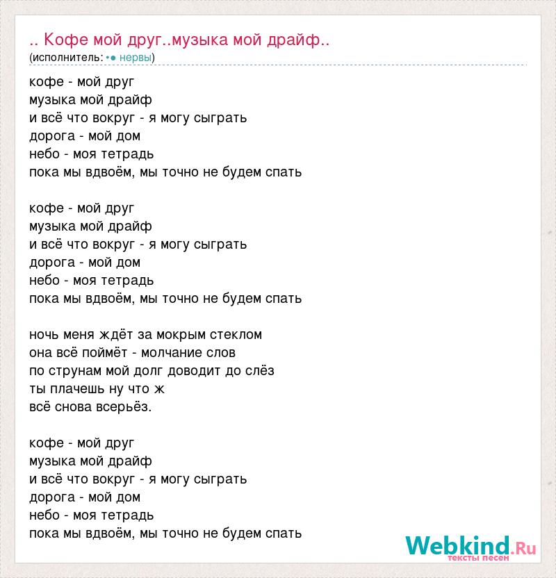 кофе - мой друг музыка мой драйф и всё что вокруг - я могу сыграть дорога - мой дом небо - моя тетрадь пока мы вдвоём, мы точно не будем спать кофе - мой друг музыка мой драйф и всё что вокруг - я могу сыграть дорога - мой дом небо - моя тетрадь пока мы вдвоём, мы точно не будем спать ночь меня ждёт за мокрым стеклом она всё поймёт - молчание слов по струнам мой долг доводит до слёз ты плачешь ну что ж всё снова всерьёз. кофе - мой друг музыка мой драйф и всё что вокруг - я могу сыграть дорога - мой дом небо - моя тетрадь пока мы вдвоём, мы точно не будем спать
