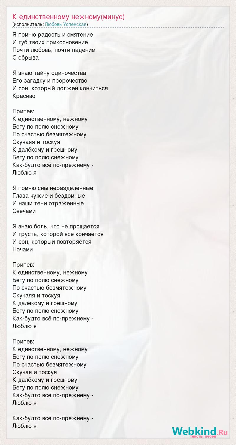 Я помню радость и смятение И губ твоих прикосновение Почти любовь, почти падение С обрыва Я знаю тайну одиночества Его загадку и пророчество И сон, который должен кончиться Красиво Припев: К единственному, нежному Бегу по полю снежному По счастью безмятежному Скучаяя и тоскуя К далёкому и грешному Бегу по полю снежному Как-будто всё по-прежнему - Люблю я Я помню сны неразделённые Глаза чужие и бездомные И наши тени отраженные Свечами Я знаю боль, что не прощается И грусть, которой всё кончается И сон, который повторяется Ночами Припев: К единственному, нежному Бегу по полю снежному По счастью безмятежному Скучаяя и тоскуя К далёкому и грешному Бегу по полю снежному Как-будто всё по-прежнему - Люблю я Припев: К единственному, нежному Бегу по полю снежному По счастью безмятежному Скучая и тоскуя К далёкому и грешному Бегу по полю снежному Как-будто всё по-прежнему - Люблю я Как-будто всё по-прежнему - Люблю я