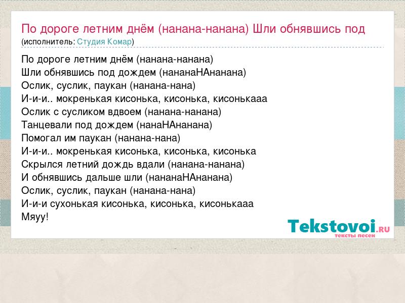 По дороге летним днём (нанана-нанана) Шли обнявшись под дождем (нананаНАнанана) Ослик, суслик, паукан (нанана-нана) И-и-и.. мокренькая кисонька, кисонька, кисонькааа Ослик с сусликом вдвоем (нанана-нанана) Танцевали под дождем (нанаНАнанана) Помогал им паукан (нанана-нана) И-и-и.. мокренькая кисонька, кисонька, кисонька Скрылся летний дождь вдали (нанана-нанана) И обнявшись дальше шли (нананаНАнанана) Ослик, суслик, паукан (нанана-нана) И-и-и сухонькая кисонька, кисонька, кисонькааа Мяуу!