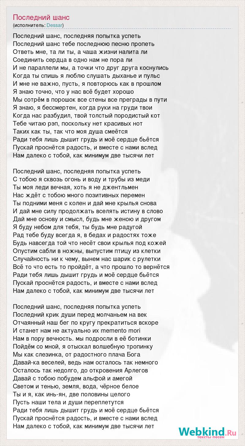 Последний шанс, последняя попытка успеть Последний шанс тебе последнюю песню пропеть Ответь мне, та ли ты, а чаша жизни налита ли Соединить сердца в одно нам не пора ли И не параллели мы, а точки что друг друга коснулись Когда ты спишь я люблю слушать дыханье и пульс И мне не важно, пусть, я повторюсь как в прошлом Я знаю точно, что у нас всё будет хорошо Мы сотрём в порошок все стены все преграды в пути Я знаю, я бессмертен, когда руки на груди твои Когда нас разбудил, твой толстый породистый кот Тебе читаю рэп, поскольку нет красивых нот Таких как ты, так что моя душа смеётся Ради тебя лишь дышит грудь и моё сердце бьётся Пускай проснётся радость, и вместе с нами вслед Нам далеко с тобой, как минимум две тысячи лет Последний шанс, последняя попытка успеть С тобою я сквозь огонь и воду и трубы из меди Ты моя леди вечная, хоть я не джентльмен Нас ждёт с тобою много позитивных перемен Ты подними меня с колен и дай мне крылья снова И дай мне силу продолжать вселять истину в слово Дай мне основу и смысл, будь мне женою и другом Я буду небом для тебя, ты будь мне радугой Рад тебе буду всегда я, в бедах и радостях тоже Будь навсегда той что несёт свои крылья под кожей Опустим сабли в ножны, выпустим птицу из клетки Случайность ни к чему, вынем нас шарик с рулетки Всё то что есть то пройдёт, а что прошло то вернётся Ради тебя лишь дышит грудь и моё сердце бьётся Пускай проснётся радость, и вместе с нами вслед Нам далеко с тобой, как минимум две тысячи лет Последний шанс, последняя попытка успеть Последний крик души перед молчаньем на век Отчаянный наш бег по кругу прекратиться вскоре И станет нам не актуально их memento mori Нам в пору вечность. мы подросли в её ботинки Пойдём со мной, я отыскал волшебную тропинку Мы как слезинка, от радостного плача Бога Давай-ка веселей, ведь нам осталось так немного Осталось так недолго, до откровения Арлегов Давай с тобою побудем альфой и амегой Светом и тенью, земля, вода, чёрное белое Ты и я, как инь-ян, две половины целого Пусть наши тела и души переплетутся Ради тебя лишь дышит грудь и моё сердце бьётся Пускай проснётся радость, и вместе с нами вслед Нам далеко с тобой, как минимум две тысячи лет
