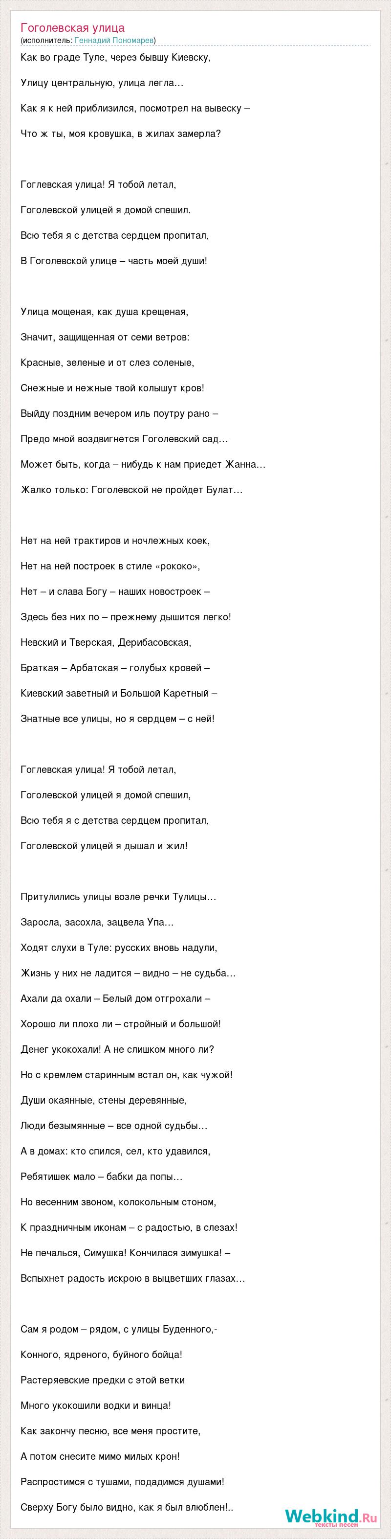 Как во граде Туле, через бывшу Киевску, Улицу центральную, улица легла… Как я к ней приблизился, посмотрел на вывеску – Что ж ты, моя кровушка, в жилах замерла? Гоглевская улица! Я тобой летал, Гоголевской улицей я домой спешил. Всю тебя я с детства сердцем пропитал, В Гоголевской улице – часть моей души! Улица мощеная, как душа крещеная, Значит, защищенная от семи ветров: Красные, зеленые и от слез соленые, Снежные и нежные твой колышут кров! Выйду поздним вечером иль поутру рано – Предо мной воздвигнется Гоголевский сад… Может быть, когда – нибудь к нам приедет Жанна… Жалко только: Гоголевской не пройдет Булат… Нет на ней трактиров и ночлежных коек, Нет на ней построек в стиле «рококо», Нет – и слава Богу – наших новостроек – Здесь без них по – прежнему дышится легко! Невский и Тверская, Дерибасовская, Браткая – Арбатская – голубых кровей – Киевский заветный и Большой Каретный – Знатные все улицы, но я сердцем – с ней! Гоглевская улица! Я тобой летал, Гоголевской улицей я домой спешил, Всю тебя я с детства сердцем пропитал, Гоголевской улицей я дышал и жил! Притулились улицы возле речки Тулицы… Заросла, засохла, зацвела Упа… Ходят слухи в Туле: русских вновь надули, Жизнь у них не ладится – видно – не судьба… Ахали да охали – Белый дом отгрохали – Хорошо ли плохо ли – стройный и большой! Денег укокохали! А не слишком много ли? Но с кремлем старинным встал он, как чужой! Души окаянные, стены деревянные, Люди безымянные – все одной судьбы… А в домах: кто спился, сел, кто удавился, Ребятишек мало – бабки да попы… Но весенним звоном, колокольным стоном, К праздничным иконам – с радостью, в слезах! Не печалься, Симушка! Кончилася зимушка! – Вспыхнет радость искрою в выцветших глазах… Сам я родом – рядом, с улицы Буденного,- Конного, ядреного, буйного бойца! Растеряевские предки с этой ветки Много укокошили водки и винца! Как закончу песню, все меня простите, А потом снесите мимо милых крон! Распростимся с тушами, подадимся душами! Сверху Богу было видно, как я был влюблен!..