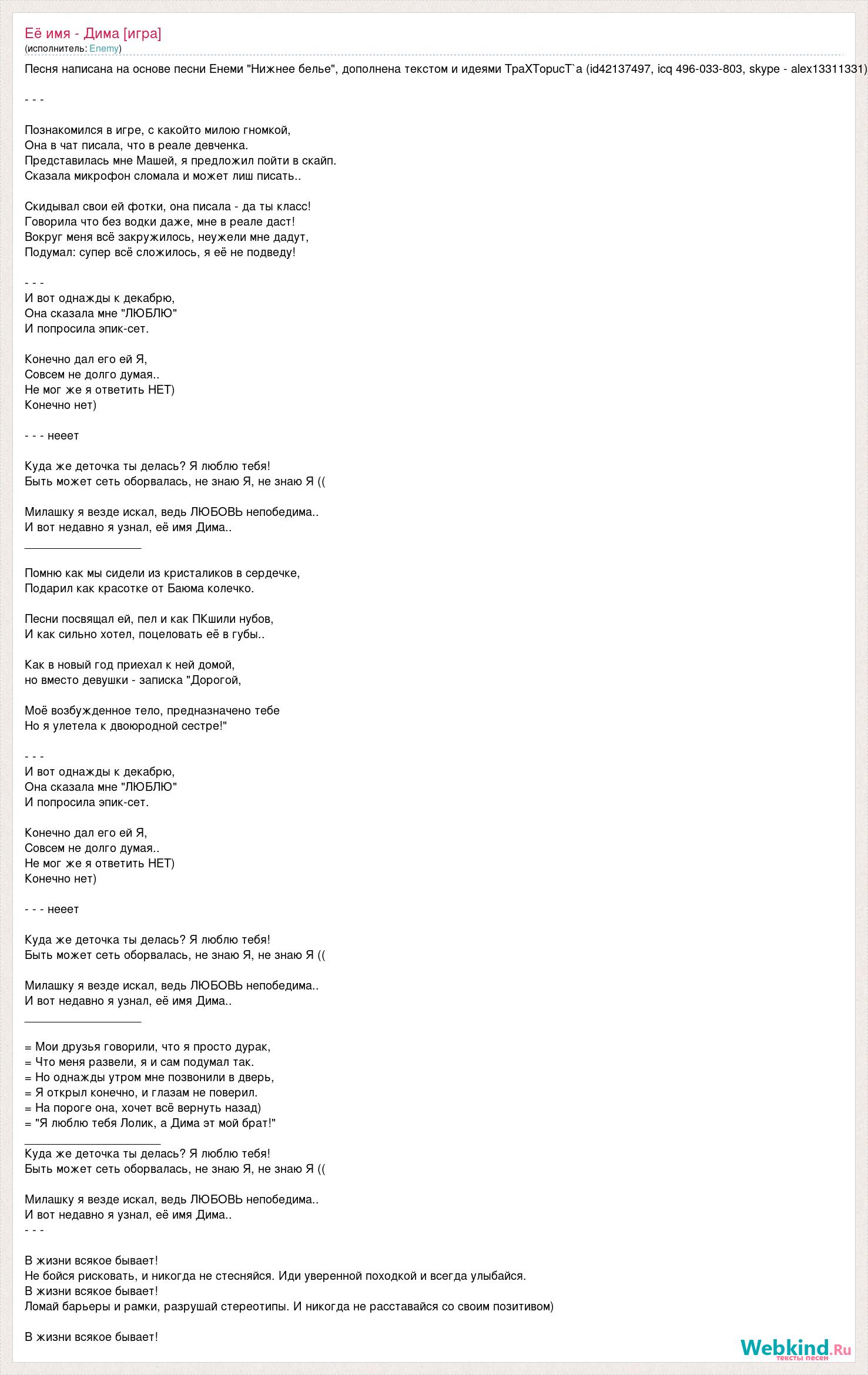 Песня написана на основе песни Енеми "Нижнее белье", дополнена текстом и идеями TpaXTopucT`а (id42137497, icq 496-033-803, skype - alex13311331) - - - Познакомился в игре, с какойто милою гномкой, Она в чат писала, что в реале девченка. Представилась мне Машей, я предложил пойти в скайп. Сказала микрофон сломала и может лиш писать.. Скидывал свои ей фотки, она писала - да ты класc! Говорила что без водки даже, мне в реале даст! Вокруг меня всё закружилось, неужели мне дадут, Подумал: супер всё сложилось, я её не подведу! - - - И вот однажды к декабрю, Она сказала мне "ЛЮБЛЮ" И попросила эпик-сет. Конечно дал его ей Я, Совсем не долго думая.. Не мог же я ответить НЕТ) Конечно нет) - - - нееет Куда же деточка ты делась? Я люблю тебя! Быть может сеть оборвалась, не знаю Я, не знаю Я (( Милашку я везде искал, ведь ЛЮБОВЬ непобедима.. И вот недавно я узнал, её имя Дима.. __________________ Помню как мы сидели из кристаликов в сердечке, Подарил как красотке от Баюма колечко. Песни посвящал ей, пел и как ПКшили нубов, И как сильно хотел, поцеловать её в губы.. Как в новый год приехал к ней домой, но вместо девушки - записка "Дорогой, Моё возбужденное тело, предназначено тебе Но я улетела к двоюродной сестре!" - - - И вот однажды к декабрю, Она сказала мне "ЛЮБЛЮ" И попросила эпик-сет. Конечно дал его ей Я, Совсем не долго думая.. Не мог же я ответить НЕТ) Конечно нет) - - - нееет Куда же деточка ты делась? Я люблю тебя! Быть может сеть оборвалась, не знаю Я, не знаю Я (( Милашку я везде искал, ведь ЛЮБОВЬ непобедима.. И вот недавно я узнал, её имя Дима.. __________________ = Мои друзья говорили, что я просто дурак, = Что меня развели, я и сам подумал так. = Но однажды утром мне позвонили в дверь, = Я открыл конечно, и глазам не поверил. = На пороге она, хочет всё вернуть назад) = "Я люблю тебя Лолик, а Дима эт мой брат!" _____________________ Куда же деточка ты делась? Я люблю тебя! Быть может сеть оборвалась, не знаю Я, не знаю Я (( Милашку я везде искал, ведь ЛЮБОВЬ непобедима.. И вот недавно я узнал, её имя Дима.. - - - В жизни всякое бывает! Не бойся рисковать, и никогда не стесняйся. Иди уверенной походкой и всегда улыбайся. В жизни всякое бывает! Ломай барьеры и рамки, разрушай стереотипы. И никогда не расставайся со своим позитивом) В жизни всякое бывает!