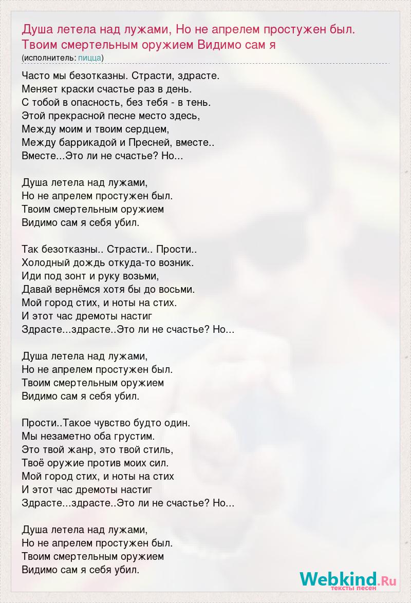 Часто мы безотказны. Страсти, здрасте. Меняет краски счастье раз в день. С тобой в опасность, без тебя - в тень. Этой прекрасной песне место здесь, Между моим и твоим сердцем, Между баррикадой и Пресней, вместе.. Вместе...Это ли не счастье? Но... Душа летела над лужами, Но не апрелем простужен был. Твоим смертельным оружием Видимо сам я себя убил. Так безотказны.. Страсти.. Прости.. Холодный дождь откуда-то возник. Иди под зонт и руку возьми, Давай вернёмся хотя бы до восьми. Мой город стих, и ноты на стих. И этот час дремоты настиг Здрасте...здрасте..Это ли не счастье? Но... Душа летела над лужами, Но не апрелем простужен был. Твоим смертельным оружием Видимо сам я себя убил. Прости..Такое чувство будто один. Мы незаметно оба грустим. Это твой жанр, это твой стиль, Твоё оружие против моих сил. Мой город стих, и ноты на стих И этот час дремоты настиг Здрасте...здрасте..Это ли не счастье? Но... Душа летела над лужами, Но не апрелем простужен был. Твоим смертельным оружием Видимо сам я себя убил.