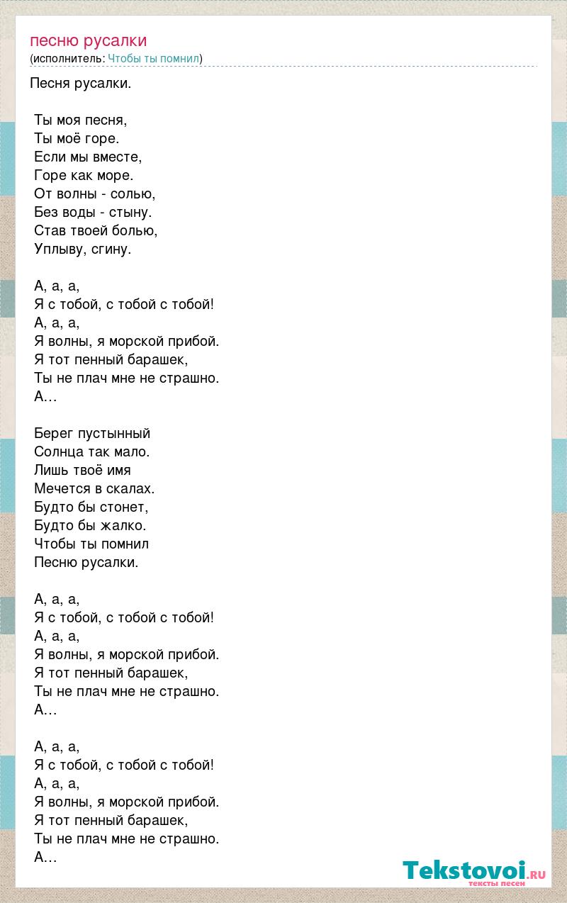 Песня русалки. Ты моя песня, Ты моё горе. Если мы вместе, Горе как море. От волны - солью, Без воды - стыну. Став твоей болью, Уплыву, сгину. А, а, а, Я с тобой, с тобой с тобой! А, а, а, Я волны, я морской прибой. Я тот пенный барашек, Ты не плач мне не страшно. А… Берег пустынный Солнца так мало. Лишь твоё имя Мечется в скалах. Будто бы стонет, Будто бы жалко. Чтобы ты помнил Песню русалки. А, а, а, Я с тобой, с тобой с тобой! А, а, а, Я волны, я морской прибой. Я тот пенный барашек, Ты не плач мне не страшно. А… А, а, а, Я с тобой, с тобой с тобой! А, а, а, Я волны, я морской прибой. Я тот пенный барашек, Ты не плач мне не страшно. А…