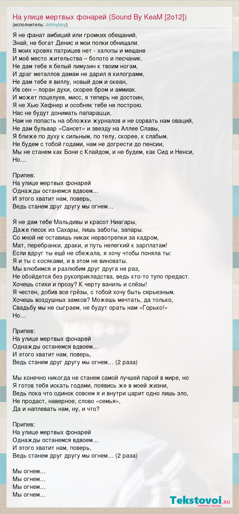 Я не фанат амбиций или громких обещаний, Знай, не богат Денис и мои полки обнищали. В моих кровях патрицев нет - халопы и мещане И моё место жительства – болото и песчаник. Не дам тебе я белый лимузин к твоим ногам, И драг металлов дамам не дарил я килограмм, Не дам тебе я виллу, новый дом и океан, Ив сен – лоран духи, скорее бром и аммиак. И может поцелуев, мисс, я теперь не достоин, Я не Хью Хефнер и особняк тебе не построю. Нас не будут донимать папарацци, Нам не попасть на обложки журналов и не сорвать нам оваций, Не дам бульвар «Сансет» и звезду на Аллее Славы, Я ближе по духу к сильным, по телу, скорее, к слабым. Не будем с тобой годами, нам не догрести до пенсии, Мы не станем как Бони с Клайдом, и не будем, как Сид и Ненси, Но… Припев: На улице мертвых фонарей Однажды останемся вдвоем… И этого хватит нам, поверь, Ведь станем друг другу мы огнем… Я не дам тебе Мальдивы и красот Ниагары, Даже песок из Сахары, лишь заботы, запары. Со мной не оставишь никак нервотрепки за кадром, Мат, перебранки, драки, и путь нелегкий к зарплатам! Если вдруг ты ещё не сбежала, я хочу чтобы поняла ты: Я и ты с косяками, и в этом не виноваты. Мы влюбимся и разлюбим друг друга не раз, Не обойдется без рукоприкладства, ведь кто-то тупо предаст. Хочешь стихи и прозу? К черту ваниль и слёзы! Я честен, добив все грёзы, с тобой хочу быть серьезным. Хочешь воздушных замков? Можешь мечтать, да только, Свадьбу мы не сыграем, не будут орать нам «Горько!» Но… Припев: На улице мертвых фонарей Однажды останемся вдвоем… И этого хватит нам, поверь, Ведь станем друг другу мы огнем… (2 раза) Мы конечно никогда не станем самой лучшей парой в мире, но Я готов тебя искать годами, появись же в моей жизни, Ведь пока что одинок совсем я и внутри царит одно лишь зло, Не продаст, наверное, слово «семья», Да и наплевать нам, ну, и что? Припев: На улице мертвых фонарей Однажды останемся вдвоем… И этого хватит нам, поверь, Ведь станем друг другу мы огнем… (2 раза) Мы огнем… Мы огнем… Мы огнем… Мы огнем…