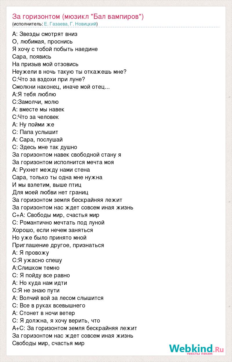 А: Звезды смотрят вниз О, любимая, проснись Я хочу с тобой побыть наедине Сара, появись На призыв мой отзовись Неужели в ночь такую ты откажешь мне? С:Что за вздохи при луне? Смолкни наконец, иначе мой отец... А:Я тебя люблю С:Замолчи, молю А: вместе мы навек С:Что за человек А: Ну пойми же С: Папа услышит А: Сара, послушай С: Здесь мне так душно За горизонтом навек свободной стану я За горизонтом исполнится мечта моя А: Рухнет между нами стена Сара, только ты одна мне нужна И мы взлетим, выше птиц Для моей любви нет границ За горизонтом земля бескрайняя лежит За горизонтом нас ждет совсем иная жизнь С+А: Свободы мир, счастья мир С: Романтично мечтать под луной Хорошо, если нечем заняться Но уже было принято мной Приглашение другое, признаться А: Я провожу С:Я ужасно спешу А:Слишком темно С: Я пойду все равно А: Но куда нам идти С:Я не знаю пути А: Волчий вой за лесом слышится С: Все в руках всевышнего А: Стонет в ночи ветер С: Я должна, я хочу верить, что А+С: За горизонтом земля бескрайняя лежит За горизонтом нас ждет совсем иная жизнь Свободы мир, счастья мир