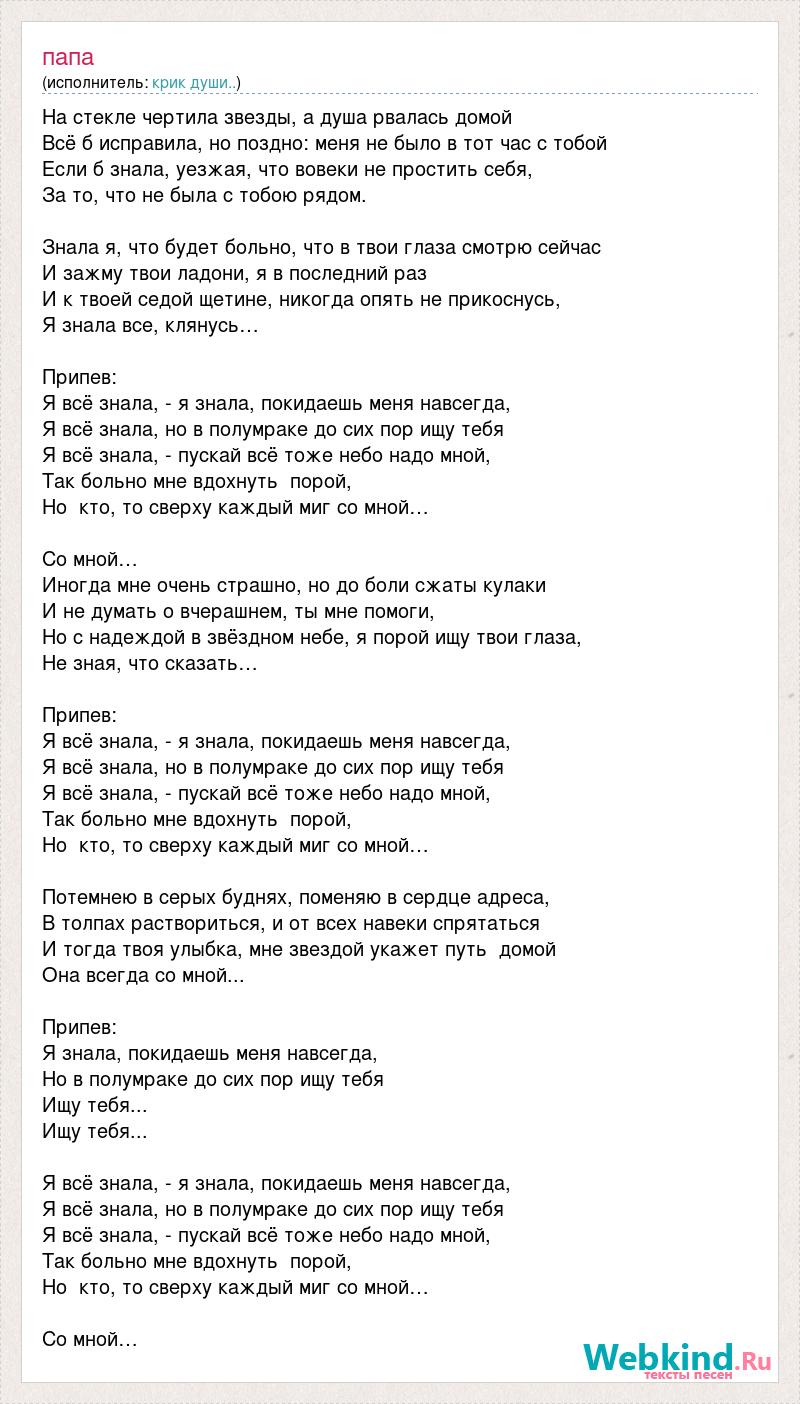 На стекле чертила звезды, а душа рвалась домой Всё б исправила, но поздно: меня не было в тот час с тобой Если б знала, уезжая, что вовеки не простить себя, За то, что не была с тобою рядом. Знала я, что будет больно, что в твои глаза смотрю сейчас И зажму твои ладони, я в последний раз И к твоей седой щетине, никогда опять не прикоснусь, Я знала все, клянусь… Припев: Я всё знала, - я знала, покидаешь меня навсегда, Я всё знала, но в полумраке до сих пор ищу тебя Я всё знала, - пускай всё тоже небо надо мной, Так больно мне вдохнуть порой, Но кто, то сверху каждый миг со мной… Со мной… Иногда мне очень страшно, но до боли сжаты кулаки И не думать о вчерашнем, ты мне помоги, Но с надеждой в звёздном небе, я порой ищу твои глаза, Не зная, что сказать… Припев: Я всё знала, - я знала, покидаешь меня навсегда, Я всё знала, но в полумраке до сих пор ищу тебя Я всё знала, - пускай всё тоже небо надо мной, Так больно мне вдохнуть порой, Но кто, то сверху каждый миг со мной… Потемнею в серых буднях, поменяю в сердце адреса, В толпах раствориться, и от всех навеки спрятаться И тогда твоя улыбка, мне звездой укажет путь домой Она всегда со мной... Припев: Я знала, покидаешь меня навсегда, Но в полумраке до сих пор ищу тебя Ищу тебя... Ищу тебя... Я всё знала, - я знала, покидаешь меня навсегда, Я всё знала, но в полумраке до сих пор ищу тебя Я всё знала, - пускай всё тоже небо надо мной, Так больно мне вдохнуть порой, Но кто, то сверху каждый миг со мной… Со мной…