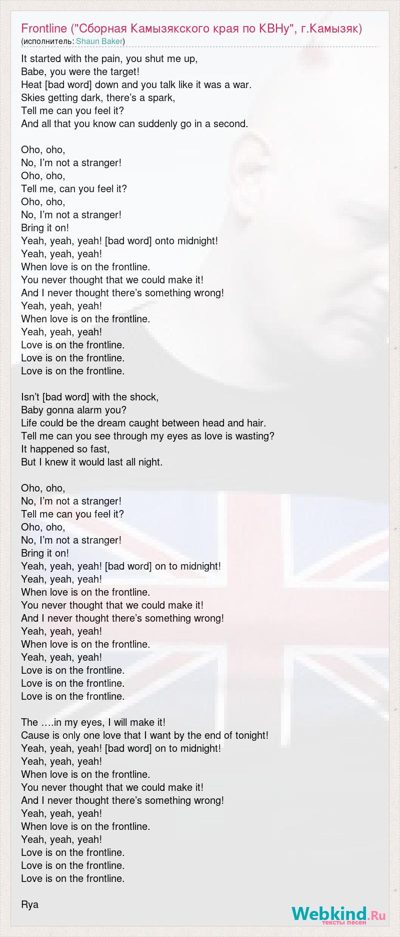 It started with the pain, you shut me up, Babe, you were the target! Heat [bad word] down and you talk like it was a war. Skies getting dark, there’s a spark, Tell me can you feel it? And all that you know can suddenly go in a second. Oho, oho, No, I’m not a stranger! Oho, oho, Tell me, can you feel it? Oho, oho, No, I’m not a stranger! Bring it on! Yeah, yeah, yeah! [bad word] onto midnight! Yeah, yeah, yeah! When love is on the frontline. You never thought that we could make it! And I never thought there’s something wrong! Yeah, yeah, yeah! When love is on the frontline. Yeah, yeah, yeah! Love is on the frontline. Love is on the frontline. Love is on the frontline. Isn’t [bad word] with the shock, Baby gonna alarm you? Life could be the dream caught between head and hair. Tell me can you see through my eyes as love is wasting? It happened so fast, But I knew it would last all night. Oho, oho, No, I’m not a stranger! Tell me can you feel it? Oho, oho, No, I’m not a stranger! Bring it on! Yeah, yeah, yeah! [bad word] on to midnight! Yeah, yeah, yeah! When love is on the frontline. You never thought that we could make it! And I never thought there’s something wrong! Yeah, yeah, yeah! When love is on the frontline. Yeah, yeah, yeah! Love is on the frontline. Love is on the frontline. Love is on the frontline. The ….in my eyes, I will make it! Cause is only one love that I want by the end of tonight! Yeah, yeah, yeah! [bad word] on to midnight! Yeah, yeah, yeah! When love is on the frontline. You never thought that we could make it! And I never thought there’s something wrong! Yeah, yeah, yeah! When love is on the frontline. Yeah, yeah, yeah! Love is on the frontline. Love is on the frontline. Love is on the frontline. Rya