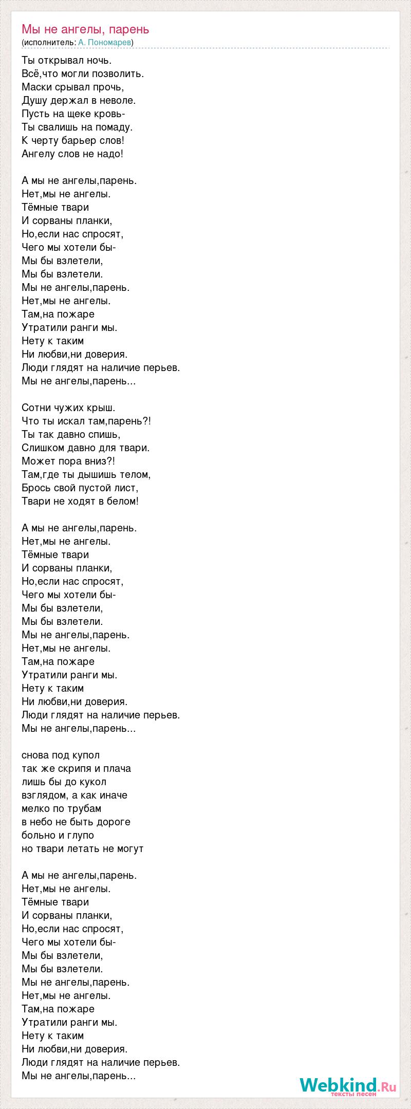 Ты открывал ночь. Всё,что могли позволить. Маски срывал прочь, Душу держал в неволе. Пусть на щеке кровь- Ты свалишь на помаду. К черту барьер слов! Ангелу слов не надо! А мы не ангелы,парень. Нет,мы не ангелы. Тёмные твари И сорваны планки, Но,если нас спросят, Чего мы хотели бы- Мы бы взлетели, Мы бы взлетели. Мы не ангелы,парень. Нет,мы не ангелы. Там,на пожаре Утратили ранги мы. Нету к таким Ни любви,ни доверия. Люди глядят на наличие перьев. Мы не ангелы,парень... Сотни чужих крыш. Что ты искал там,парень?! Ты так давно спишь, Слишком давно для твари. Может пора вниз?! Там,где ты дышишь телом, Брось свой пустой лист, Твари не ходят в белом! А мы не ангелы,парень. Нет,мы не ангелы. Тёмные твари И сорваны планки, Но,если нас спросят, Чего мы хотели бы- Мы бы взлетели, Мы бы взлетели. Мы не ангелы,парень. Нет,мы не ангелы. Там,на пожаре Утратили ранги мы. Нету к таким Ни любви,ни доверия. Люди глядят на наличие перьев. Мы не ангелы,парень... снова под купол так же скрипя и плача лишь бы до кукол взглядом, а как иначе мелко по трубам в небо не быть дороге больно и глупо но твари летать не могут А мы не ангелы,парень. Нет,мы не ангелы. Тёмные твари И сорваны планки, Но,если нас спросят, Чего мы хотели бы- Мы бы взлетели, Мы бы взлетели. Мы не ангелы,парень. Нет,мы не ангелы. Там,на пожаре Утратили ранги мы. Нету к таким Ни любви,ни доверия. Люди глядят на наличие перьев. Мы не ангелы,парень...