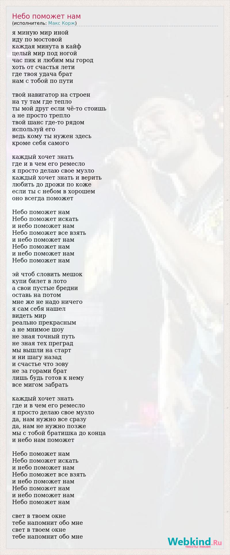 я миную мир иной иду по мостовой каждая минута в кайф целый мир под ногой час пик и любим мы город хоть от счастья лети где твоя удача брат нам с тобой по пути твой навигатор на строен на ту там где тепло ты мой друг если чё-то стоишь а не просто трепло твой шанс где-то рядом используй его ведь кому ты нужен здесь кроме себя самого каждый хочет знать где и в чем его ремесло я просто делаю свое музло каждый хочет знать и верить любить до дрожи по коже если ты с небом в хорошем оно всегда поможет Небо поможет нам Небо поможет искать и небо поможет нам Небо поможет все взять и небо поможет нам Небо поможет нам и небо поможет нам Небо поможет нам эй чтоб словить мешок купи билет в лото а свои пустые бредни оставь на потом мне же не надо ничего я сам себя нашел видеть мир реально прекрасным а не мнимое шоу не зная точный путь не зная тех преград мы вышли на старт и ни шагу назад и счастье что зову не за горами брат лишь будь готов к нему все мигом забрать каждый хочет знать где и в чем его ремесло я просто делаю свое музло да, нам нужно все сразу да, нам не нужно позже мы с тобой братишка до конца и небо нам поможет Небо поможет нам Небо поможет искать и небо поможет нам Небо поможет все взять и небо поможет нам Небо поможет нам и небо поможет нам Небо поможет нам свет в твоем окне тебе напомнит обо мне свет в твоем окне тебе напомнит обо мне