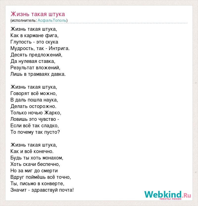 Жизнь такая штука, Как в кармане фига, Глупость - это скука Мудрость, так - Интрига. Десять предложений, Да нулевая ставка, Результат вложений, Лишь в трамваях давка. Жизнь такая штука, Говорят всё можно, В даль пошла наука, Делать осторожно. Только ночью Жарко, Ловишь это чувство - Если всё так сладко, То почему так пусто? Жизнь такая штука, Как и всё конечно. Будь ты хоть монахом, Хоть скачи беспечно, Но за миг до смерти Вдруг поймёшь всё точно, Ты, письмо в конверте, Значит - здравствуй почта!