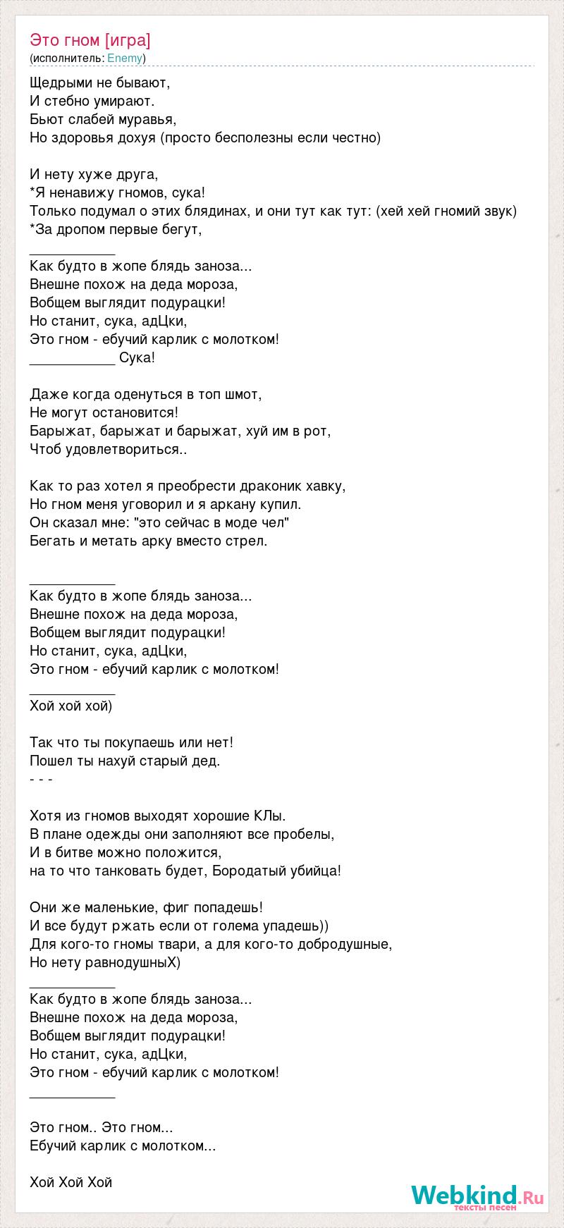 Щедрыми не бывают, И стебно умирают. Бьют слабей муравья, Но здоровья дохуя (просто бесполезны если честно) И нету хуже друга, *Я ненавижу гномов, сука! Только подумал о этих блядинах, и они тут как тут: (хей хей гномий звук) *За дропом первые бегут, ___________ Как будто в жопе блядь заноза... Внешне похож на деда мороза, Вобщем выглядит подурацки! Но станит, сука, адЦки, Это гном - ебучий карлик с молотком! ___________ Сука! Даже когда оденуться в топ шмот, Не могут остановится! Барыжат, барыжат и барыжат, хуй им в рот, Чтоб удовлетвориться.. Как то раз хотел я преобрести драконик хавку, Но гном меня уговорил и я аркану купил. Он сказал мне: "это сейчас в моде чел" Бегать и метать арку вместо стрел. ___________ Как будто в жопе блядь заноза... Внешне похож на деда мороза, Вобщем выглядит подурацки! Но станит, сука, адЦки, Это гном - ебучий карлик с молотком! ___________ Хой хой хой) Так что ты покупаешь или нет! Пошел ты нахуй старый дед. - - - Хотя из гномов выходят хорошие КЛы. В плане одежды они заполняют все пробелы, И в битве можно положится, на то что танковать будет, Бородатый убийца! Они же маленькие, фиг попадешь! И все будут ржать если от голема упадешь)) Для кого-то гномы твари, а для кого-то добродушные, Но нету равнодушныХ) ___________ Как будто в жопе блядь заноза... Внешне похож на деда мороза, Вобщем выглядит подурацки! Но станит, сука, адЦки, Это гном - ебучий карлик с молотком! ___________ Это гном.. Это гном... Ебучий карлик с молотком... Хой Хой Хой