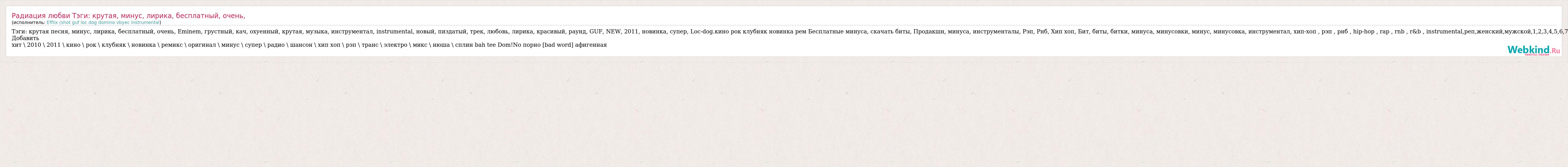 Главная→Исполнители→Efflix (shot guf loc dog domino vbyec instrumental→Радиация любви Тэги: крутая, минус, лирика, бесплатный, очень,