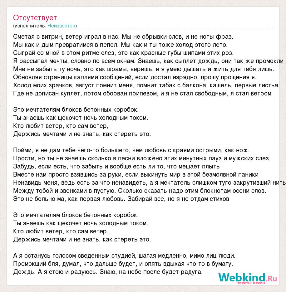 Сметая с витрин, ветер играл в нас. Мы не обрывки слов, и не ноты фраз. Мы как и дым превратимся в пепел. Мы как и ты тоже холод этого лето. Сыграй со мной в этом ритме слез, это как красные губы шипами этих роз. Я рассыпал мечты, словно по всем окнам. Знаешь, как сыплет дождь, они так же промокли Мне не забыть ту ночь, это как шрамы, веришь, и я умею дышать и жить для тебя лишь. Обновляя страницы каплями сообщений, если достал изрядно, прошу прощения я. Холод моих зрачков, август помнит меня, помнит табак с балкона, кашель, первые листья Где не дописан куплет, потом оборван припевом, и я не стал свободным, я стал ветром Это мечтателям блоков бетонных коробок. Ты знаешь как щекочет ночь холодным током. Кто любит ветер, кто сам ветер, Держись мечтами и не знать, как стереть это. Пойми, я не дам тебе чего-то большего, чем любовь с краями острыми, как нож. Прости, но ты не знаешь сколько в песни вложено этих минутных пауз и мужских слез, Забудь, если есть, что забыть и вообще есть ли то, что мешает плыть Вместе нам просто взявшись за руки, если выкинуть мир в этой безмолвной паники Ненавидь меня, ведь есть за что ненавидеть, а я мечтатель слишком туго закрутивший нить Между тобой и звонками в пустую. Сколько сказать надо этим блокнотам осени слов. Это не больно ма, как первая любовь. Забирай все, но я не отдам стихов Это мечтателям блоков бетонных коробок. Ты знаешь как щекочет ночь холодным током. Кто любит ветер, кто сам ветер, Держись мечтами и не знать, как стереть это. А я останусь голосом сведенным студией, шагая медленно, мимо лиц люди. Промокший бля, думал, что дальше будет, и опять вдыхая что-то в бумагу. Дождь. А я стою и радуюсь. Знаю, на небе после будет радуга.