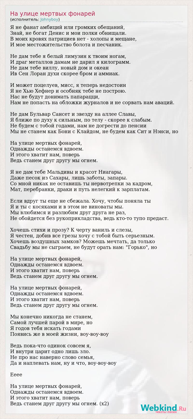 Я не фанат амбиций или громких обещаний, Знай, не богат Денис и мои полки обнищали. В моих кровях патрициев нет - холопы и мещане, И мое местожительство болота и песчаник. Не дам тебе я белый лимузин к твоим ногам, И драг металлов дамам не дарил я килограмм. Не дам тебе виллу, новый дом и океан Ив Сен Лоран духи скорее бром и аммиак. И может поцелуев, мисс, я теперь недостоин Я не Хью Хефнер и особняк тебе не построю. Нас не будут донимать папарацци, Нам не попасть на обложки журналов и не сорвать нам аваций. Не дам Бульвар Сансет и звезду на аллее Славы, Я ближе по духу к сильным, по телу - скорее к слабым. Не будем с тобой годами, нам не догрести до пенсии Мы не станем как Бони с Клайдом, не будем как Сит и Нэнси, но На улице мертвых фонарей, Однажды останемся вдвоем. И этого хватит нам, поверь Ведь станем друг другу мы огнем. Я не дам тебе Мальдивы и красот Ниагары, Даже песок из Сахары, лишь заботы, запары. Со мной никак не оставишь ты нервотрепки за кадром, Мат, перебранки, драки и путь нелегкий к зарплатам. Если вдруг ты еще не сбежала. Хочу, чтобы поняла ты Я и ты с косяками и в этом не виноваты мы. Мы влюбимся и разлюбим друг друга не раз, Не обойдется без рукоприкладства, ведь кто-то тупо предаст. Хочешь стихи и прозу? К черту ваниль и слезы, Я честен, добив все грезы хочу с тобой быть серьезным. Хочешь воздушных замков? Можешь мечтать, да только Свадьбу мы не сыграем, не будут орать нам: "Горько", но На улице мертвых фонарей, Однажды останемся вдвоем. И этого хватит нам, поверь Ведь станем друг другу мы огнем. На улице мертвых фонарей, Однажды останемся вдвоем. И этого хватит нам, поверь Ведь станем друг другу мы огнем. Мы конечно никогда не станем, Самой лучшей парой в мире, но Я годов тебя искать годами Появись же в моей жизни, воу-воу-воу Ведь пока-что одинок совсем я, И внутри царит одно лишь зло. Не про нас наверно слово семья, Да и наплевать нам, ну и что, воу-воу-воу Ееее На улице мертвых фонарей, Однажды останемся вдвоем. И этого хватит нам, поверь Ведь станем друг другу мы огнем. (x2)