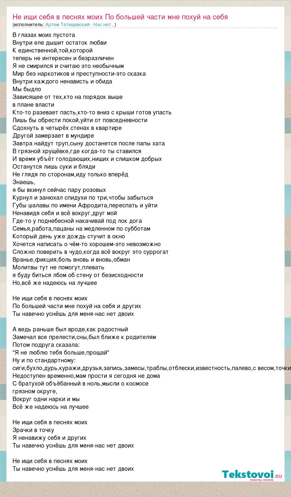В глазах моих пустота Внутри еле дышит остаток любви К единственной,той,которой теперь не интересен и безразличен Я не смирился и считаю это необычным Мир без наркотиков и преступности-это сказка Внутри каждого ненависть и обида Мы быдло Зависящее от тех,кто на порядок выше в плане власти Кто-то разевает пасть,кто-то вниз с крыши готов упасть Лишь бы обрести покой,уйти от повседневности Сдохнуть в четырёх стенах в квартире Другой замерзает в мундире Завтра найдут труп,сыну достанется после папы хата В грязной хрущёвке,где когда-то ты ставился И время убъёт голодающих,нищих и слишком добрых Останутся лишь суки и бляди Не глядя по сторонам,иду только вперёд Знаешь, я бы вкинул сейчас пару розовых Курнул и занюхал спидухи по три,чтобы забыться Губы шалавы по имени Афродита,переспать и уйти Ненавидя себя и всё вокруг,друг мой Где-то у поднебесной накачивай под лок дога Семья,работа,пацаны на медленном по субботам Который день уже дождь стучит в окно Хочется написать о чём-то хорошем-это невозможно Сложно поверить в чудо,когда всё вокруг это суррогат Вранье,фикция,боль вновь и вновь,обман Молитвы тут не помогут,плевать я буду биться лбом об стену от безисходности Но,всё же надеюсь на лучшее Не ищи себя в песнях моих По большей части мне похуй на себя и других Ты навечно уснёшь для меня-нас нет двоих А ведь раньше был вроде,как радостный Замечал все прелести,сны,был ближе к родителям Потом подруга сказала: "Я не люблю тебя больше,прощай" Ну и по стандартному: сиги,бухло,дурь,куражи,друзья,запись,замесы,траблы,отблески,известность,палево,с весом,точки Недоступен временно,мам прости я сегодня не дома С братухой объёбанный в ноль,мысли о космосе грязном округе, Вокруг одни нарки и мы Всё же надеюсь на лучшее Не ищи себя в песнях моих Зрачки в точку Я ненавижу себя и других Ты навечно уснёшь для меня-нас нет двоих Не ищи себя в песнях моих Ты навечно уснёшь для меня-нас нет двоих