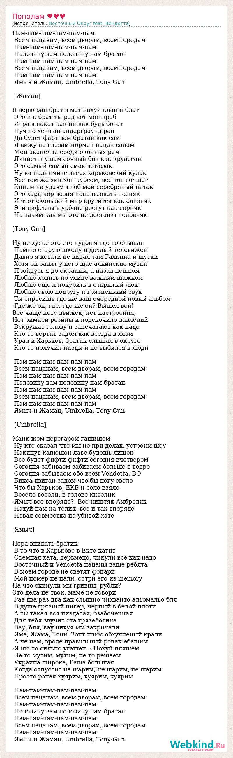 Пам-пам-пам-пам-пам-пам Всем пацанам, всем дворам, всем городам Пам-пам-пам-пам-пам-пам Половину вам половину нам братан Пам-пам-пам-пам-пам-пам Всем пацанам, всем дворам, всем городам Пам-пам-пам-пам-пам-пам Ямыч и Жаман, Umbrella, Tony-Gun [Жаман] Я верю рап брат в мат нахуй клап и блат Это и к брат ты рад вот мой краб Игра в накат как ни как будь богат Пуч йо хенз ап андерграунд рап Да будет фарт вам братан как сам Я вижу по глазам нормал пацан салам Мои акапелла среди оконных рам Липнет к ушам сочный бит как круассан Это самый самый смак вотафак Ну ка поднимите вверх харьковский кулак Все тем же хип хоп курсом, все тот же шаг Кинем на удачу в лоб мой серебряный пятак Это хард-кор возня использовать позняк И этот скользкий мир крутится как слизняк Эти дифекты в урбане ростут как сорняк Но таким как мы это не доставит головняк [Tony-Gun] Ну не хуясе это сто пудов я где то слышал Помню старую школу и дохлый телевижен Давно я кстати не видал там Галкина и шутки Хотя он занят у него щас алкинские мутки Пройдусь я до окраины, а назад пешком Люблю ходить по улице важным шажком Люблю еще я покурить в открытый люк Люблю свою подругу и грязненький звук Ты спросишь где же ваш очередной новый альбом -Где же он, где, где же он?-Вышел вон! Все чаще нету движек, нет настроения, Нет зимней резины и подскочило давлений Вскружат голову и запечатают как надо Кто то вертит задом как всегда в хлам Урал и Харьков, братик слышал в округе Кто то получил пизды и не выбился в люди Пам-пам-пам-пам-пам-пам Всем пацанам, всем дворам, всем городам Пам-пам-пам-пам-пам-пам Половину вам половину нам братан Пам-пам-пам-пам-пам-пам Всем пацанам, всем дворам, всем городам Пам-пам-пам-пам-пам-пам Ямыч и Жаман, Umbrella, Tony-Gun [Umbrella] Майк жом перегаром гашишом Ну кто сказал что мы не при делах, устроим шоу Накинув капюшон лаве будешь лишен Все будет фифти фифти сегодня вчетвером Сегодня забиваем забиваем больше в ведро Сегодня забываем обо всем Vendetta, ВО Бикса двигай задом что бы ногу свело Что бы Харьков, ЕКБ и село взяло Весело весели, в голове киселик -Ямыч все впоряде? -Все ништяк Амбрелик Нахуй нам на телик, все и так впоряде Новая совместка на убитой хате [Ямыч] Пора вникать братик В то что в Харькове в Екте катит Съемная хата, дерьмецо, чикули все как надо Восточный и Vendetta пацаны ваще ребята В моем городе не светят фонари Мой номер не пали, сотри его из memory На что скинули мы гривны, рубли? Это дела не твои, маме не говори Раз два раз два как слышно чихванто альомальо бля В душе грязный нигер, черный в белой плоти А ты такая вся пиздатая, озабоченная Для тебя звучит эта грязеботина Вау, бля, вау нихуя мы закричали Яма, Жама, Тони, Зонт плюс обхуяченый крали А че нам, вроде правильный рэпак ебашим -Я шо то сильно угашен. - Похуй пляшем Че то мутим, мутим, че то решаем Украина широка, Раша большая Когда отпустит не шарим, не шарим, не шарим Просто рэпак хуярим, хуярим, хуярим Пам-пам-пам-пам-пам-пам Всем пацанам, всем дворам, всем городам Пам-пам-пам-пам-пам-пам Половину вам половину нам братан Пам-пам-пам-пам-пам-пам Всем пацанам, всем дворам, всем городам Пам-пам-пам-пам-пам-пам Ямыч и Жаман, Umbrella, Tony-Gun