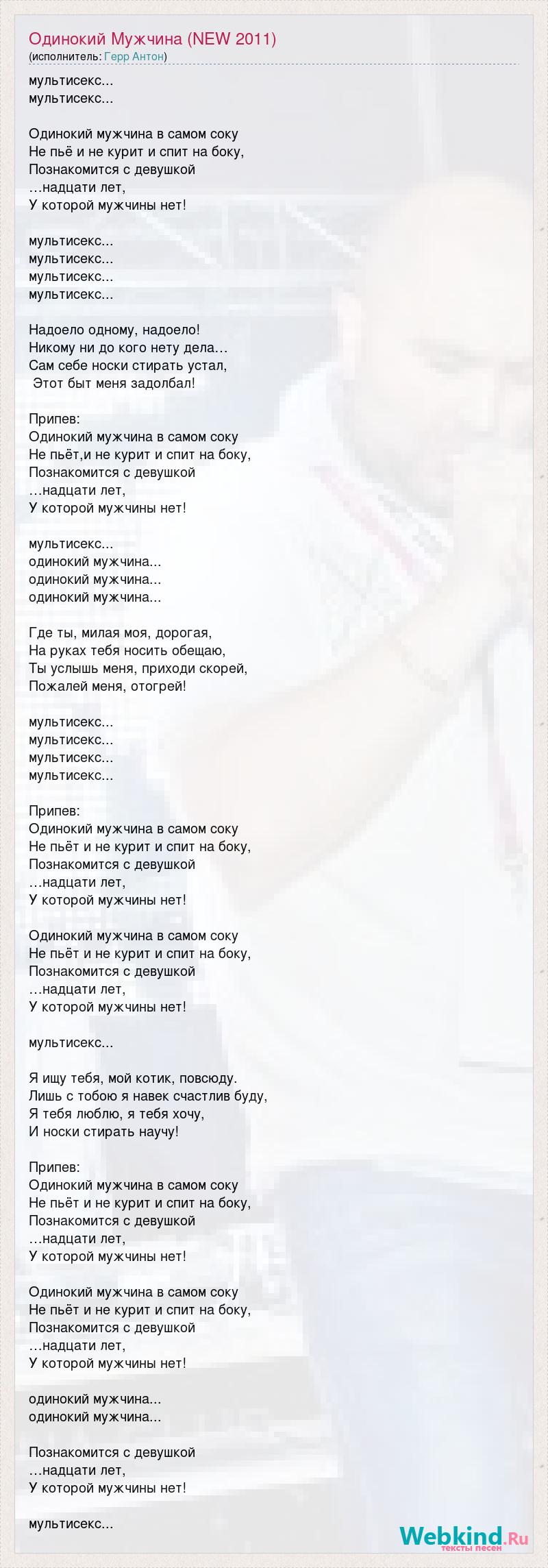 мультисекс... мультисекс... Одинокий мужчина в самом соку Не пьё и не курит и спит на боку, Познакомится с девушкой …надцати лет, У которой мужчины нет! мультисекс... мультисекс... мультисекс... мультисекс... Надоело одному, надоело! Никому ни до кого нету дела… Сам себе носки стирать устал, Этот быт меня задолбал! Припев: Одинокий мужчина в самом соку Не пьёт,и не курит и спит на боку, Познакомится с девушкой …надцати лет, У которой мужчины нет! мультисекс... одинокий мужчина... одинокий мужчина... одинокий мужчина... Где ты, милая моя, дорогая, На руках тебя носить обещаю, Ты услышь меня, приходи скорей, Пожалей меня, отогрей! мультисекс... мультисекс... мультисекс... мультисекс... Припев: Одинокий мужчина в самом соку Не пьёт и не курит и спит на боку, Познакомится с девушкой …надцати лет, У которой мужчины нет! Одинокий мужчина в самом соку Не пьёт и не курит и спит на боку, Познакомится с девушкой …надцати лет, У которой мужчины нет! мультисекс... Я ищу тебя, мой котик, повсюду. Лишь с тобою я навек счастлив буду, Я тебя люблю, я тебя хочу, И носки стирать научу! Припев: Одинокий мужчина в самом соку Не пьёт и не курит и спит на боку, Познакомится с девушкой …надцати лет, У которой мужчины нет! Одинокий мужчина в самом соку Не пьёт и не курит и спит на боку, Познакомится с девушкой …надцати лет, У которой мужчины нет! одинокий мужчина... одинокий мужчина... Познакомится с девушкой …надцати лет, У которой мужчины нет! мультисекс...