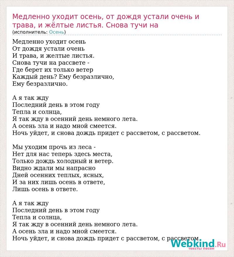 Медленно уходит осень От дождя устали очень И трава, и желтые листья. Снова тучи на рассвете - Где берет их только ветер Каждый день? Ему безразлично, Ему безразлично. А я так жду Последний день в этом году Тепла и солнца, Я так жду в осенний день немного лета. А осень зла и надо мной смеется. Ночь уйдет, и снова дождь придет с рассветом, с рассветом. Мы уходим прочь из леса - Нет для нас теперь здесь места, Только дождь холодный и ветер. Видно ждали мы напрасно Дней осенних теплых, ясных, И за них лишь осень в ответе, Лишь осень в ответе. А я так жду Последний день в этом году Тепла и солнца, Я так жду в осенний день немного лета. А осень зла и надо мной смеется. Ночь уйдет, и снова дождь придет с рассветом, с рассветом
