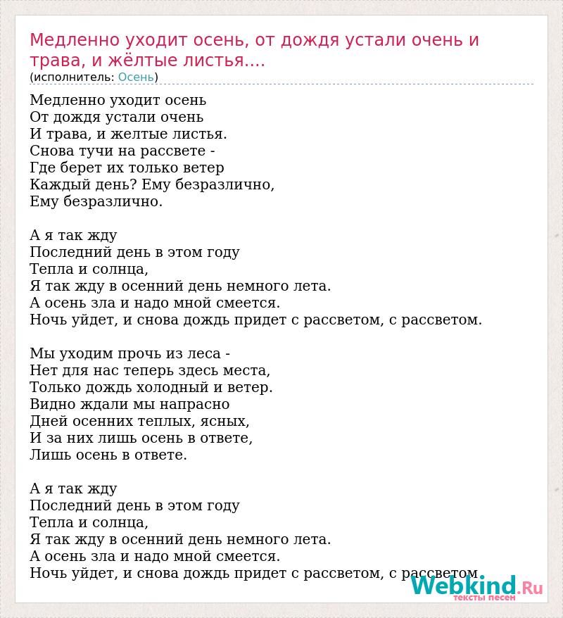 Медленно уходит осень От дождя устали очень И трава, и желтые листья. Снова тучи на рассвете - Где берет их только ветер Каждый день? Ему безразлично, Ему безразлично. А я так жду Последний день в этом году Тепла и солнца, Я так жду в осенний день немного лета. А осень зла и надо мной смеется. Ночь уйдет, и снова дождь придет с рассветом, с рассветом. Мы уходим прочь из леса - Нет для нас теперь здесь места, Только дождь холодный и ветер. Видно ждали мы напрасно Дней осенних теплых, ясных, И за них лишь осень в ответе, Лишь осень в ответе. А я так жду Последний день в этом году Тепла и солнца, Я так жду в осенний день немного лета. А осень зла и надо мной смеется. Ночь уйдет, и снова дождь придет с рассветом, с рассветом