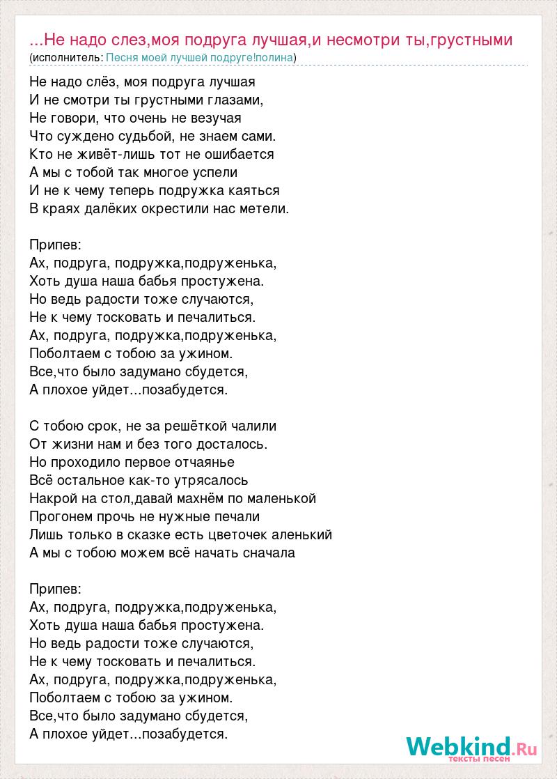 Главная→Исполнители→Песня моей лучшей подруге!полина→...Не надо слез,моя подруга лучшая,и несмотри ты,грустными