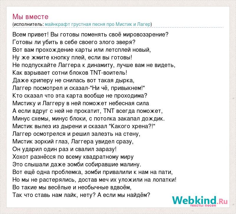 Всем привет! Вы готовы поменять своё мировоззрение? Готовы ли убить в себе своего злого зверя? Вот вам прохождение карты или летсплей новый, Ну же жмите кнопку плей, если вы готовы! Не подпускайте Лаггера к динамиту, лучше вам не видеть, Как взрывает сотни блоков TNT-воитель! Даже криперу не снилась вот такая дырка, Лаггер посмотрел и сказал-"Ни чё, привыкнем!" Кто сказал что эта карта вообще не проходима? Мистику и Лаггеру в ней поможет небесная сила А если вдруг с ней не прокатит, TNT всегда поможет, Минус схемы, минус блоки, с потолка закапал дождик. Мистик вылез из дырени и сказал "Какого хрена?!" Лаггер осмотрелся и решил залезть на стену, Мистик зоркий глаз, Лаггера увидел сразу, Он ударил один раз и свалил заразу! Хохот разнёсся по всему квадратному миру Это слышали даже зомби собиравшие малину. Вот ещё одна проблемка, зомби привалили к нам на пати, Но мы не растерялись, достав меч их уложили на лопатки! Во такие мы весёлые и необычные вдвоём, Так что ставь нам лайк, нету? А если мы найдём?