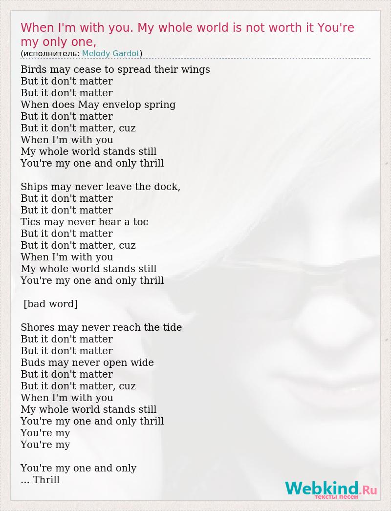 Birds may cease to spread their wings But it don't matter But it don't matter When does May envelop spring But it don't matter But it don't matter, cuz When I'm with you My whole world stands still You're my one and only thrill Ships may never leave the dock, But it don't matter But it don't matter Tics may never hear a toc But it don't matter But it don't matter, cuz When I'm with you My whole world stands still You're my one and only thrill [bad word] Shores may never reach the tide But it don't matter But it don't matter Buds may never open wide But it don't matter But it don't matter, cuz When I'm with you My whole world stands still You're my one and only thrill You're my You're my You're my one and only ... Thrill