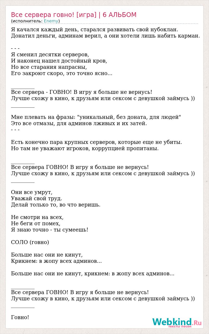 Я качался каждый день, старался развивать свой нубоклан. Донатил деньги, админам верил, а они хотели лишь набить карман. - - - Я сменил десятки серверов, И наконец нашел достойный кров, Но все старания напрасны, Его закроют скоро, это точно ясно... _________ Все сервера - ГОВНО! В игру я больше не вернусь! Лучше схожу в кино, к друзьям или сексом с девушкой займусь )) _________ Мне плевать на фразы: "уникальный, без доната, для людей" Это все отмазы, для админов лживых и их затей. - - - Есть конечно пара крупных серверов, которые еще не убиты. Но там не уважают игроков, коррупцией пропитаны. _________ Все сервера ГОВНО! В игру я больше не вернусь! Лучше схожу в кино, к друзьям или сексом с девушкой займусь )) _________ Они все умрут, Уважай свой труд. Делай только то, во что веришь. Не смотри на всех, Не беги от помех, Я знаю точно - ты сумеешь! СОЛО (говно) Больше нас они не кинут, Крикнем: в жопу всех админов... Больше нас они не кинут, крикнем: в жопу всех админов... _________ Все сервера ГОВНО! В игру я больше не вернусь! Лучше схожу в кино, к друзьям или сексом с девушкой займусь )) _________ Говно!