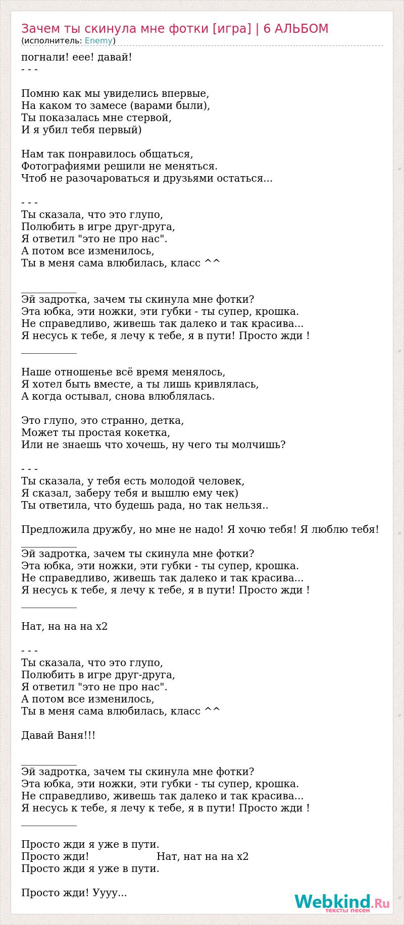 погнали! еее! давай! - - - Помню как мы увиделись впервые, На каком то замесе (варами были), Ты показалась мне стервой, И я убил тебя первый) Нам так понравилось общаться, Фотографиями решили не меняться. Чтоб не разочароваться и друзьями остаться... - - - Ты сказала, что это глупо, Полюбить в игре друг-друга, Я ответил "это не про нас". А потом все изменилось, Ты в меня сама влюбилась, класс ^^ ___________ Эй задротка, зачем ты скинула мне фотки? Эта юбка, эти ножки, эти губки - ты супер, крошка. Не справедливо, живешь так далеко и так красива... Я несусь к тебе, я лечу к тебе, я в пути! Просто жди ! ___________ Наше отношенье всё время менялось, Я хотел быть вместе, а ты лишь кривлялась, А когда остывал, снова влюблялась. Это глупо, это странно, детка, Может ты простая кокетка, Или не знаешь что хочешь, ну чего ты молчишь? - - - Ты сказала, у тебя есть молодой человек, Я сказал, заберу тебя и вышлю ему чек) Ты ответила, что будешь рада, но так нельзя.. Предложила дружбу, но мне не надо! Я хочю тебя! Я люблю тебя! ___________ Эй задротка, зачем ты скинула мне фотки? Эта юбка, эти ножки, эти губки - ты супер, крошка. Не справедливо, живешь так далеко и так красива... Я несусь к тебе, я лечу к тебе, я в пути! Просто жди ! ___________ Нат, на на на х2 - - - Ты сказала, что это глупо, Полюбить в игре друг-друга, Я ответил "это не про нас". А потом все изменилось, Ты в меня сама влюбилась, класс ^^ Давай Ваня!!! ___________ Эй задротка, зачем ты скинула мне фотки? Эта юбка, эти ножки, эти губки - ты супер, крошка. Не справедливо, живешь так далеко и так красива... Я несусь к тебе, я лечу к тебе, я в пути! Просто жди ! ___________ Просто жди я уже в пути. Просто жди! Нат, нат на на х2 Просто жди я уже в пути. Просто жди! Уууу...