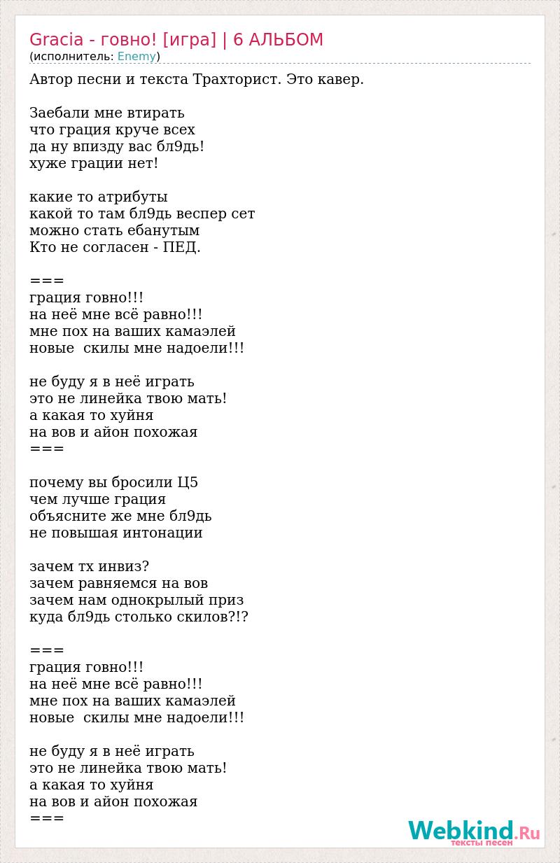 Автор песни и текста Трахторист. Это кавер. Заебали мне втирать что грация круче всех да ну впизду вас бл9дь! хуже грации нет! какие то атрибуты какой то там бл9дь веспер сет можно стать ебанутым Кто не согласен - ПЕД. === грация говно!!! на неё мне всё равно!!! мне пох на ваших камаэлей новые скилы мне надоели!!! не буду я в неё играть это не линейка твою мать! а какая то хуйня на вов и айон похожая === почему вы бросили Ц5 чем лучше грация объясните же мне бл9дь не повышая интонации зачем тх инвиз? зачем равняемся на вов зачем нам однокрылый приз куда бл9дь столько скилов?!? === грация говно!!! на неё мне всё равно!!! мне пох на ваших камаэлей новые скилы мне надоели!!! не буду я в неё играть это не линейка твою мать! а какая то хуйня на вов и айон похожая ===