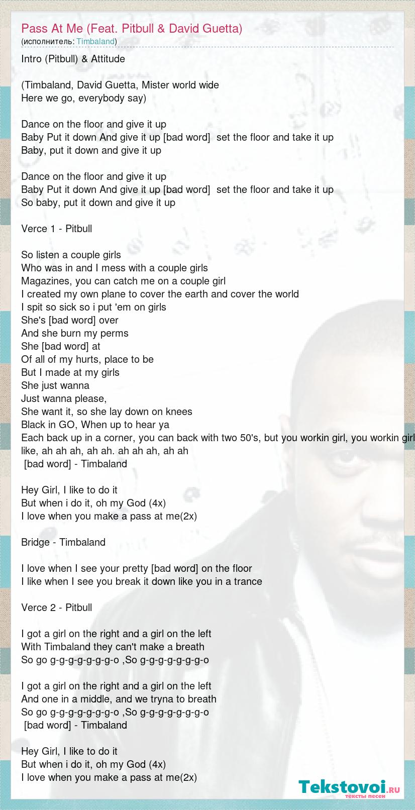Intro (Pitbull) & Attitude (Timbaland, David Guetta, Mister world wide Here we go, everybody say) Dance on the floor and give it up Baby Put it down And give it up [bad word] set the floor and take it up Baby, put it down and give it up Dance on the floor and give it up Baby Put it down And give it up [bad word] set the floor and take it up So baby, put it down and give it up Verce 1 - Pitbull So listen a couple girls Who was in and I mess with a couple girls Magazines, you can catch me on a couple girl I created my own plane to cover the earth and cover the world I spit so sick so i put 'em on girls She's tryna come over And she burn my perms She tryna come at Of all of my hurts, place to be But I made at my girls She just wanna Just wanna please, She want it, so she lay down on knees Black in GO, When up to hear ya Each back up in a corner, you can back with two 50's, but you workin girl, you workin girl like, ah ah ah, ah ah. ah ah ah, ah ah Chorus - Timbaland Hey Girl, I like to do it But when i do it, oh my God (4x) I love when you make a pass at me(2x) Bridge - Timbaland I love when I see your pretty [bad word] on the floor I like when I see you break it down like you in a trance Verce 2 - Pitbull I got a girl on the right and a girl on the left With Timbaland they can't make a breath So go g-g-g-g-g-g-g-o ,So g-g-g-g-g-g-g-o I got a girl on the right and a girl on the left And one in a middle, and we tryna to breath So go g-g-g-g-g-g-g-o ,So g-g-g-g-g-g-g-o Chorus - Timbaland Hey Girl, I like to do it But when i do it, oh my God (4x) I love when you make a pass at me(2x)