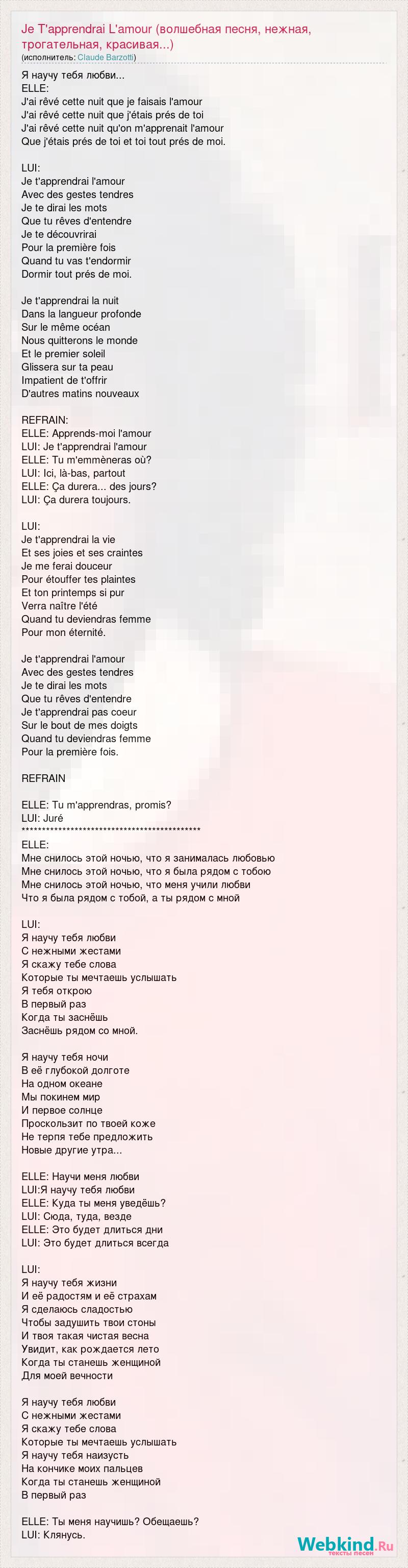 Я научу тебя любви... ELLE: J'ai rêvé cette nuit que je faisais l'amour J'ai rêvé cette nuit que j'étais prés de toi J'ai rêvé cette nuit qu'on m'apprenait l'amour Que j'étais prés de toi et toi tout prés de moi. LUI: Je t'apprendrai l'amour Avec des gestes tendres Je te dirai les mots Que tu rêves d'entendre Je te découvrirai Pour la première fois Quand tu vas t'endormir Dormir tout prés de moi. Je t'apprendrai la nuit Dans la langueur profonde Sur le même océan Nous quitterons le monde Et le premier soleil Glissera sur ta peau Impatient de t'offrir D'autres matins nouveaux REFRAIN: ELLE: Apprends-moi l'amour LUI: Je t'apprendrai l'amour ELLE: Tu m'emmèneras où? LUI: Ici, là-bas, partout ELLE: Ça durera... des jours? LUI: Ça durera toujours. LUI: Je t'apprendrai la vie Et ses joies et ses craintes Je me ferai douceur Pour étouffer tes plaintes Et ton printemps si pur Verra naître l'été Quand tu deviendras femme Pour mon éternité. Je t'apprendrai l'amour Avec des gestes tendres Je te dirai les mots Que tu rêves d'entendre Je t'apprendrai pas coeur Sur le bout de mes doigts Quand tu deviendras femme Pour la première fois. REFRAIN ELLE: Tu m'apprendras, promis? LUI: Juré ******************************************** ELLE: Мне снилось этой ночью, что я занималась любовью Мне снилось этой ночью, что я была рядом с тобою Мне снилось этой ночью, что меня учили любви Что я была рядом с тобой, а ты рядом с мной LUI: Я научу тебя любви С нежными жестами Я скажу тебе слова Которые ты мечтаешь услышать Я тебя открою В первый раз Когда ты заснёшь Заснёшь рядом со мной. Я научу тебя ночи В её глубокой долготе На одном океане Мы покинем мир И первое солнце Проскользит по твоей коже Не терпя тебе предложить Новые другие утра... ELLE: Научи меня любви LUI:Я научу тебя любви ELLE: Куда ты меня уведёшь? LUI: Сюда, туда, везде ELLE: Это будет длиться дни LUI: Это будет длиться всегда LUI: Я научу тебя жизни И её радостям и её страхам Я сделаюсь сладостью Чтобы задушить твои стоны И твоя такая чистая весна Увидит, как рождается лето Когда ты станешь женщиной Для моей вечности Я научу тебя любви С нежными жестами Я скажу тебе слова Которые ты мечтаешь услышать Я научу тебя наизусть На кончике моих пальцев Когда ты станешь женщиной В первый раз ELLE: Ты меня научишь? Обещаешь? LUI: Клянусь.