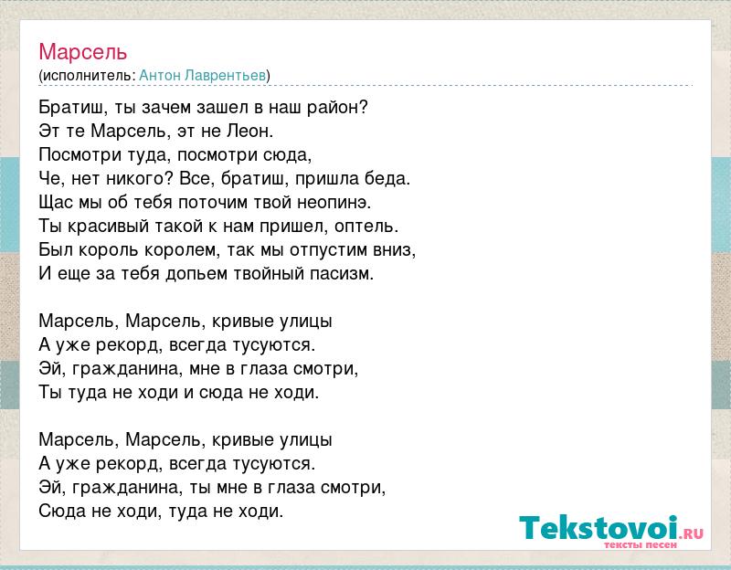 Братиш, ты зачем зашел в наш район? Эт те Марсель, эт не Леон. Посмотри туда, посмотри сюда, Че, нет никого? Все, братиш, пришла беда. Щас мы об тебя поточим твой неопинэ. Ты красивый такой к нам пришел, оптель. Был король королем, так мы отпустим вниз, И еще за тебя допьем твойный пасизм. Марсель, Марсель, кривые улицы А уже рекорд, всегда тусуются. Эй, гражданина, мне в глаза смотри, Ты туда не ходи и сюда не ходи. Марсель, Марсель, кривые улицы А уже рекорд, всегда тусуются. Эй, гражданина, ты мне в глаза смотри, Сюда не ходи, туда не ходи.