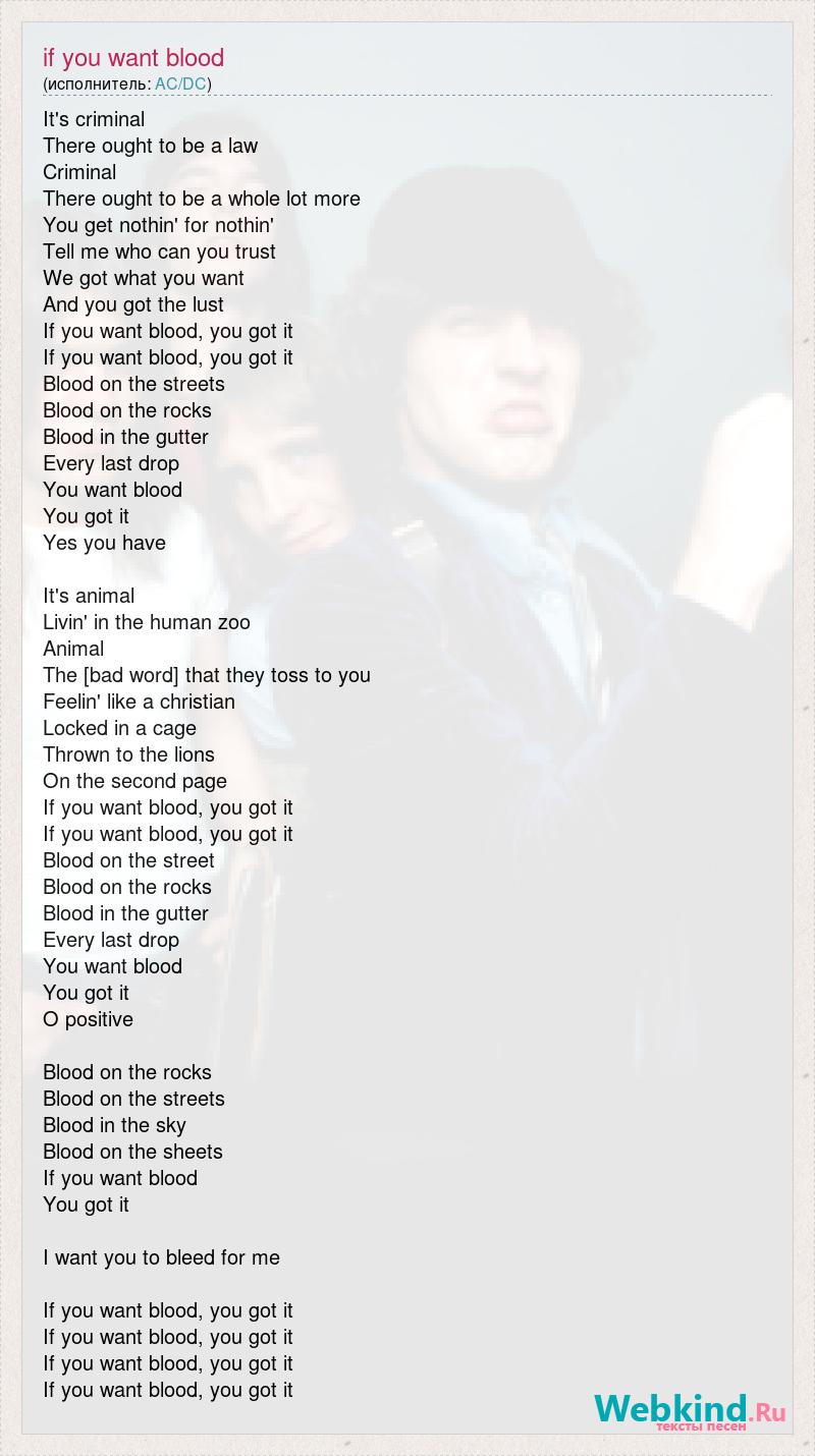 It's criminal There ought to be a law Criminal There ought to be a whole lot more You get nothin' for nothin' Tell me who can you trust We got what you want And you got the lust If you want blood, you got it If you want blood, you got it Blood on the streets Blood on the rocks Blood in the gutter Every last drop You want blood You got it Yes you have It's animal Livin' in the human zoo Animal The [bad word] that they toss to you Feelin' like a christian Locked in a cage Thrown to the lions On the second page If you want blood, you got it If you want blood, you got it Blood on the street Blood on the rocks Blood in the gutter Every last drop You want blood You got it O positive Blood on the rocks Blood on the streets Blood in the sky Blood on the sheets If you want blood You got it I want you to bleed for me If you want blood, you got it If you want blood, you got it If you want blood, you got it If you want blood, you got it
