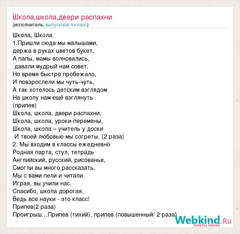 Школа, Школа 1.Пришли сюда мы малышами, держа в руках цветов букет. А папы, мамы волновались, давали мудрый нам совет. Но время быстро пробежало, И повзрослели мы чуть-чуть, А так хотелось детским взглядом На школу нам ещё взглянуть (припев) Школа, школа, двери распахни, Школа, школа, уроки-перемены, Школа, школа – учитель у доски И твоей любовью мы согреты. (2 раза) 2. Мы входим в классы ежедневно Родная парта, стул, тетрадь Английский, русский, рисованье, Смогли вы много рассказать. Мы с вами пели и читали Играя, вы учили нас. Спасибо, школа дорогая, Ведь все науки - это класс! Припев(2 раза) Проигрыш…Припев (тихий), припев (повышенный/ 2 раза)