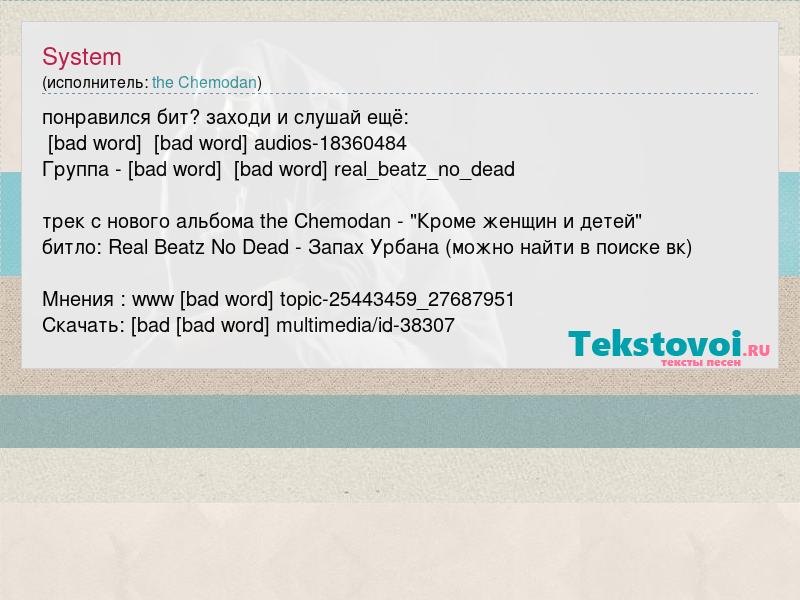 понравился бит? заходи и слушай ещё: [bad word] [bad word] audios-18360484 Группа - [bad word] [bad word] real_beatz_no_dead трек с нового альбома the Chemodan - "Кроме женщин и детей" битло: Real Beatz No Dead - Запах Урбана (можно найти в поиске вк) Мнения : www [bad word] topic-25443459_27687951 Скачать: [bad word] ru/multimedia/id-38307