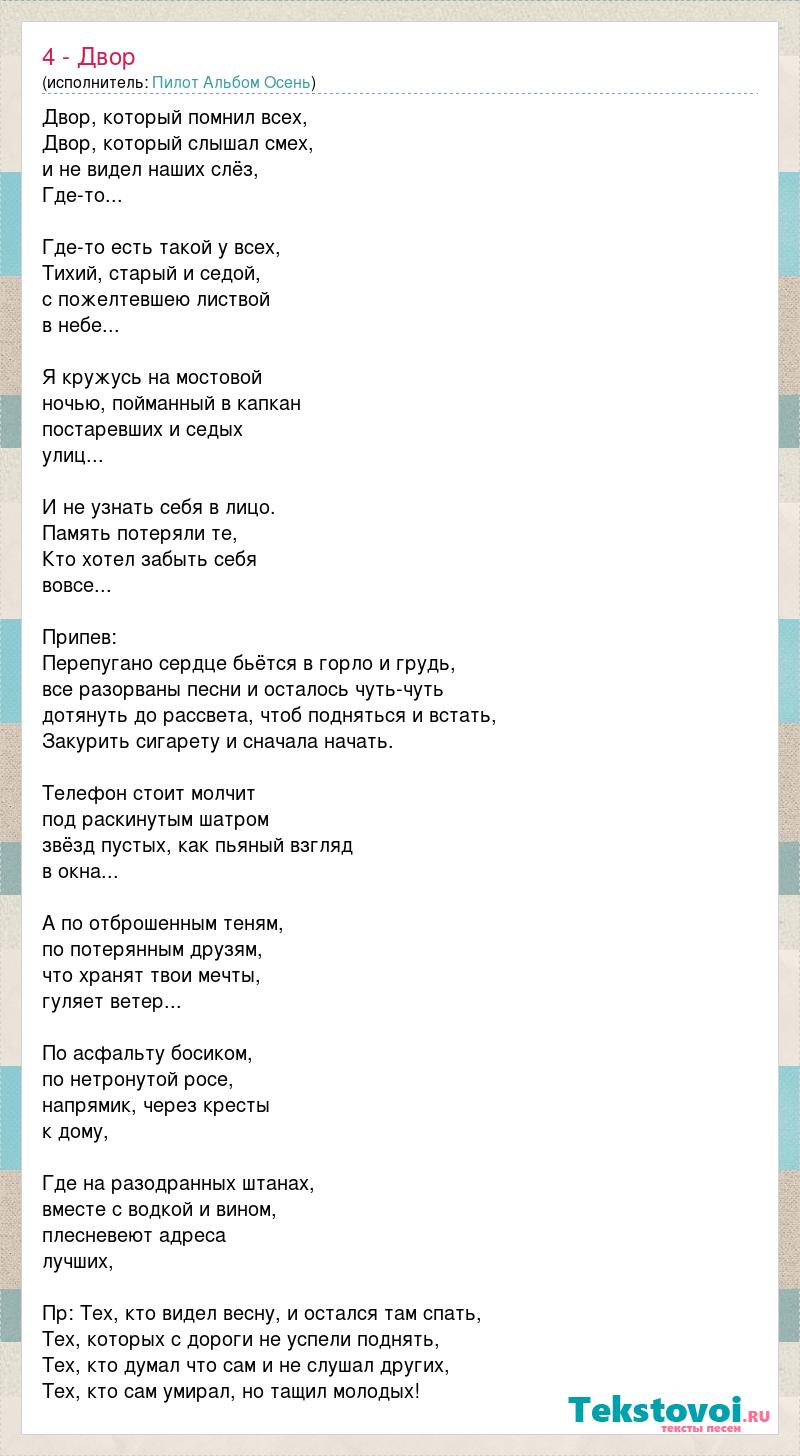 Двор, который помнил всех, Двор, который слышал смех, и не видел наших слёз, Где-то... Где-то есть такой у всех, Тихий, старый и седой, с пожелтевшею листвой в небе... Я кружусь на мостовой ночью, пойманный в капкан постаревших и седых улиц... И не узнать себя в лицо. Память потеряли те, Кто хотел забыть себя вовсе... Припев: Перепугано сердце бьётся в горло и грудь, все разорваны песни и осталось чуть-чуть дотянуть до рассвета, чтоб подняться и встать, Закурить сигарету и сначала начать. Телефон стоит молчит под раскинутым шатром звёзд пустых, как пьяный взгляд в окна... А по отброшенным теням, по потерянным друзям, что хранят твои мечты, гуляет ветер... По асфальту босиком, по нетронутой росе, напрямик, через кресты к дому, Где на разодранных штанах, вместе с водкой и вином, плесневеют адреса лучших, Пр: Тех, кто видел весну, и остался там спать, Тех, которых с дороги не успели поднять, Тех, кто думал что сам и не слушал других, Тех, кто сам умирал, но тащил молодых!