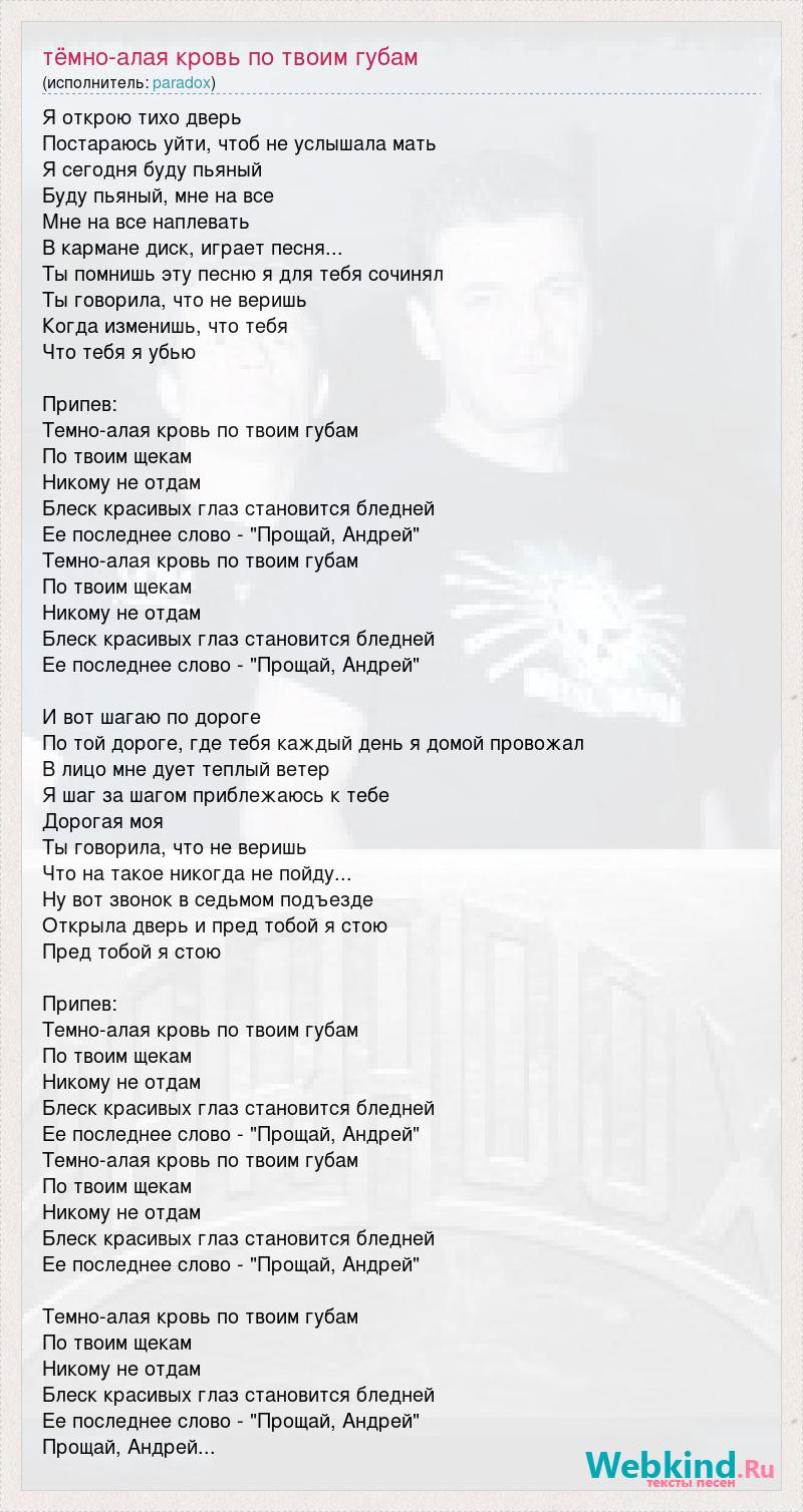 Я открою тихо дверь Постараюсь уйти, чтоб не услышала мать Я сегодня буду пьяный Буду пьяный, мне на все Мне на все наплевать В кармане диск, играет песня... Ты помнишь эту песню я для тебя сочинял Ты говорила, что не веришь Когда изменишь, что тебя Что тебя я убью Припев: Темно-алая кровь по твоим губам По твоим щекам Никому не отдам Блеск красивых глаз становится бледней Ее последнее слово - "Прощай, Андрей" Темно-алая кровь по твоим губам По твоим щекам Никому не отдам Блеск красивых глаз становится бледней Ее последнее слово - "Прощай, Андрей" И вот шагаю по дороге По той дороге, где тебя каждый день я домой провожал В лицо мне дует теплый ветер Я шаг за шагом приблежаюсь к тебе Дорогая моя Ты говорила, что не веришь Что на такое никогда не пойду... Ну вот звонок в седьмом подъезде Открыла дверь и пред тобой я стою Пред тобой я стою Припев: Темно-алая кровь по твоим губам По твоим щекам Никому не отдам Блеск красивых глаз становится бледней Ее последнее слово - "Прощай, Андрей" Темно-алая кровь по твоим губам По твоим щекам Никому не отдам Блеск красивых глаз становится бледней Ее последнее слово - "Прощай, Андрей" Темно-алая кровь по твоим губам По твоим щекам Никому не отдам Блеск красивых глаз становится бледней Ее последнее слово - "Прощай, Андрей" Прощай, Андрей...