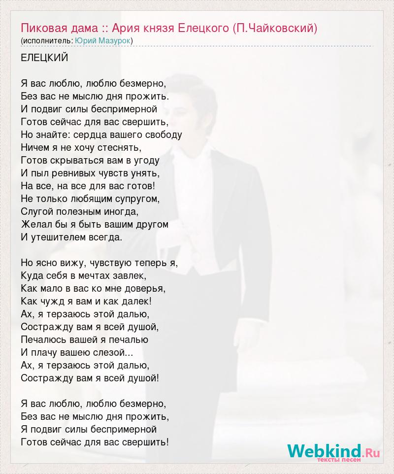 ЕЛЕЦКИЙ Я вас люблю, люблю безмерно, Без вас не мыслю дня прожить. И подвиг силы беспримерной Готов сейчас для вас свершить, Но знайте: сердца вашего свободу Ничем я не хочу стеснять, Готов скрываться вам в угоду И пыл ревнивых чувств унять, На все, на все для вас готов! Не только любящим супругом, Слугой полезным иногда, Желал бы я быть вашим другом И утешителем всегда. Но ясно вижу, чувствую теперь я, Куда себя в мечтах завлек, Как мало в вас ко мне доверья, Как чужд я вам и как далек! Ах, я терзаюсь этой далью, Состражду вам я всей душой, Печалюсь вашей я печалью И плачу вашею слезой... Ах, я терзаюсь этой далью, Состражду вам я всей душой! Я вас люблю, люблю безмерно, Без вас не мыслю дня прожить, Я подвиг силы беспримерной Готов сейчас для вас свершить!