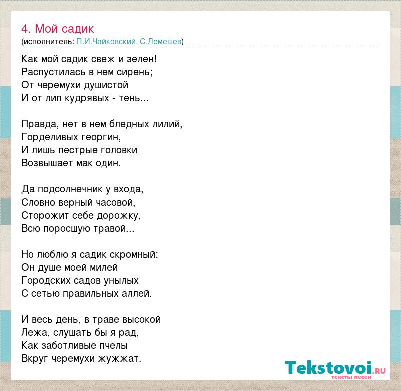 Как мой садик свеж и зелен! Распустилась в нем сирень; От черемухи душистой И от лип кудрявых - тень... Правда, нет в нем бледных лилий, Горделивых георгин, И лишь пестрые головки Возвышает мак один. Да подсолнечник у входа, Словно верный часовой, Сторожит себе дорожку, Всю поросшую травой... Но люблю я садик скромный: Он душе моей милей Городских садов унылых С сетью правильных аллей. И весь день, в траве высокой Лежа, слушать бы я рад, Как заботливые пчелы Вкруг черемухи жужжат.