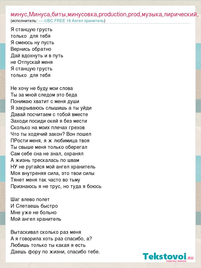 Я станцую грусть только для тебя Я смеюсь ну пусть Вернись обратно Дай вдохнуть и в путь не Отпускай меня Я станцую грусть только для тебя Не хочу не буду мои слова Ты за мной следом это беда Понимаю хватит с меня души Я закрываюсь слышишь а ты уйди Давай посчитаем с тобой вместе Заходи посиди окей я без мести Сколько на моих плечах грехов Что ты ходячий закон? Вон пошел ПРости меня, я ж любимица твоя Ты свыше меня только оберегал Сам себе сна не знал, охранял А жизнь трескалась по швам НУ не ругайся мой ангел хранитель Моя внутреняя сила, это твои силы Тянет меня так часто во тьму Признаюсь я не трус, но туда я боюсь Шаг влево полет И Слетаешь быстро Мне уже не больно Мой ангел хранитель Вытаскивал сколько раз меня А я говорила хоть раз спасибо, а? Любишь только ты какая я есть Даешь фору по жизни, спасибо тебе.