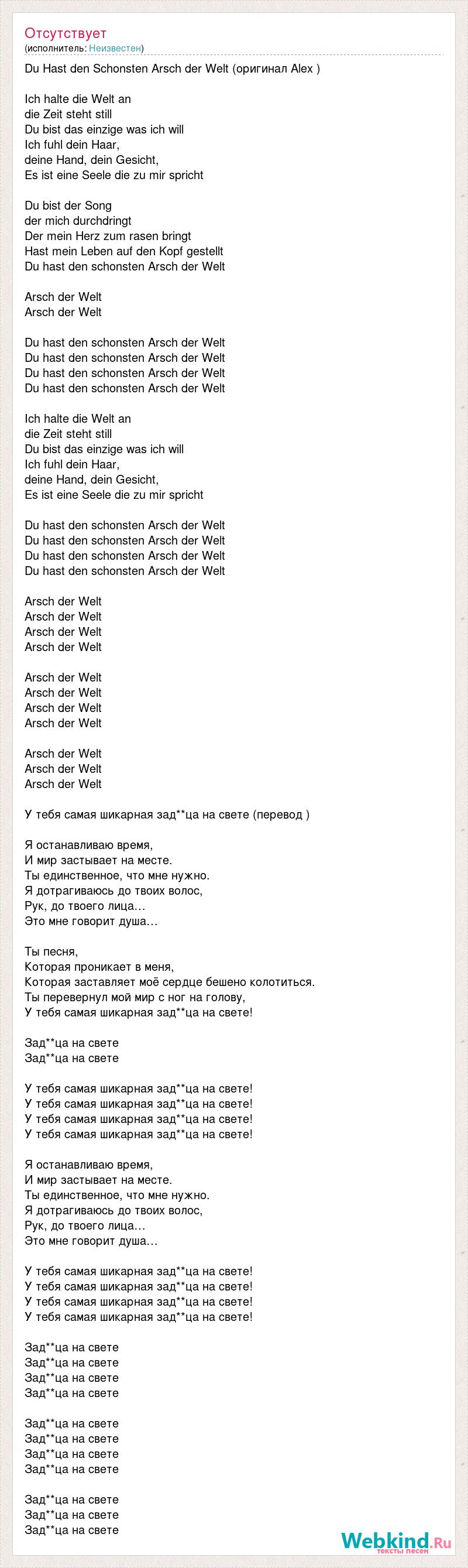 Du Hast den Schonsten Arsch der Welt (оригинал Alex ) Ich halte die Welt an die Zeit steht still Du bist das einzige was ich will Ich fuhl dein Haar, deine Hand, dein Gesicht, Es ist eine Seele die zu mir spricht Du bist der Song der mich durchdringt Der mein Herz zum rasen bringt Hast mein Leben auf den Kopf gestellt Du hast den schonsten Arsch der Welt Arsch der Welt Arsch der Welt Du hast den schonsten Arsch der Welt Du hast den schonsten Arsch der Welt Du hast den schonsten Arsch der Welt Du hast den schonsten Arsch der Welt Ich halte die Welt an die Zeit steht still Du bist das einzige was ich will Ich fuhl dein Haar, deine Hand, dein Gesicht, Es ist eine Seele die zu mir spricht Du hast den schonsten Arsch der Welt Du hast den schonsten Arsch der Welt Du hast den schonsten Arsch der Welt Du hast den schonsten Arsch der Welt Arsch der Welt Arsch der Welt Arsch der Welt Arsch der Welt Arsch der Welt Arsch der Welt Arsch der Welt Arsch der Welt Arsch der Welt Arsch der Welt Arsch der Welt У тебя самая шикарная зад**ца на свете (перевод ) Я останавливаю время, И мир застывает на месте. Ты единственное, что мне нужно. Я дотрагиваюсь до твоих волос, Рук, до твоего лица… Это мне говорит душа… Ты песня, Которая проникает в меня, Которая заставляет моё сердце бешено колотиться. Ты перевернул мой мир с ног на голову, У тебя самая шикарная зад**ца на свете! Зад**ца на свете Зад**ца на свете У тебя самая шикарная зад**ца на свете! У тебя самая шикарная зад**ца на свете! У тебя самая шикарная зад**ца на свете! У тебя самая шикарная зад**ца на свете! Я останавливаю время, И мир застывает на месте. Ты единственное, что мне нужно. Я дотрагиваюсь до твоих волос, Рук, до твоего лица… Это мне говорит душа… У тебя самая шикарная зад**ца на свете! У тебя самая шикарная зад**ца на свете! У тебя самая шикарная зад**ца на свете! У тебя самая шикарная зад**ца на свете! Зад**ца на свете Зад**ца на свете Зад**ца на свете Зад**ца на свете Зад**ца на свете Зад**ца на свете Зад**ца на свете Зад**ца на свете Зад**ца на свете Зад**ца на свете Зад**ца на свете