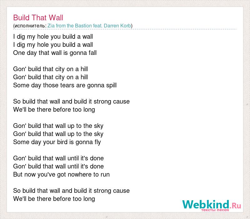 I dig my hole you build a wall I dig my hole you build a wall One day that wall is gonna fall Gon' build that city on a hill Gon' build that city on a hill Some day those tears are gonna spill So build that wall and build it strong cause We'll be there before too long Gon' build that wall up to the sky Gon' build that wall up to the sky Some day your bird is gonna fly Gon' build that wall until it's done Gon' build that wall until it's done But now you've got nowhere to run So build that wall and build it strong cause We'll be there before too long