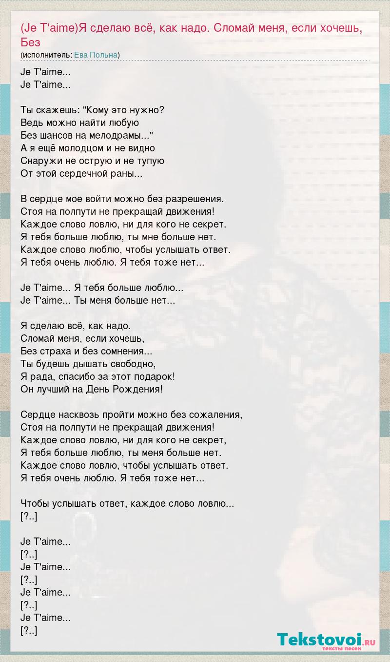 Je T'aime... Je T'aime... Ты скажешь: "Кому это нужно? Ведь можно найти любую Без шансов на мелодрамы..." А я ещё молодцом и не видно Снаружи не острую и не тупую От этой сердечной раны... В сердце мое войти можно без разрешения. Стоя на полпути не прекращай движения! Каждое слово ловлю, ни для кого не секрет. Я тебя больше люблю, ты мне больше нет. Каждое слово люблю, чтобы услышать ответ. Я тебя очень люблю. Я тебя тоже нет... Je T'aime... Я тебя больше люблю... Je T'aime... Ты меня больше нет... Я сделаю всё, как надо. Сломай меня, если хочешь, Без страха и без сомнения... Ты будешь дышать свободно, Я рада, спасибо за этот подарок! Он лучший на День Рождения! Сердце насквозь пройти можно без сожаления, Стоя на полпути не прекращай движения! Каждое слово ловлю, ни для кого не секрет, Я тебя больше люблю, ты меня больше нет. Каждое слово ловлю, чтобы услышать ответ. Я тебя очень люблю. Я тебя тоже нет... Чтобы услышать ответ, каждое слово ловлю... [?..] Je T'aime... [?..] Je T'aime... [?..] Je T'aime... [?..] Je T'aime... [?..]
