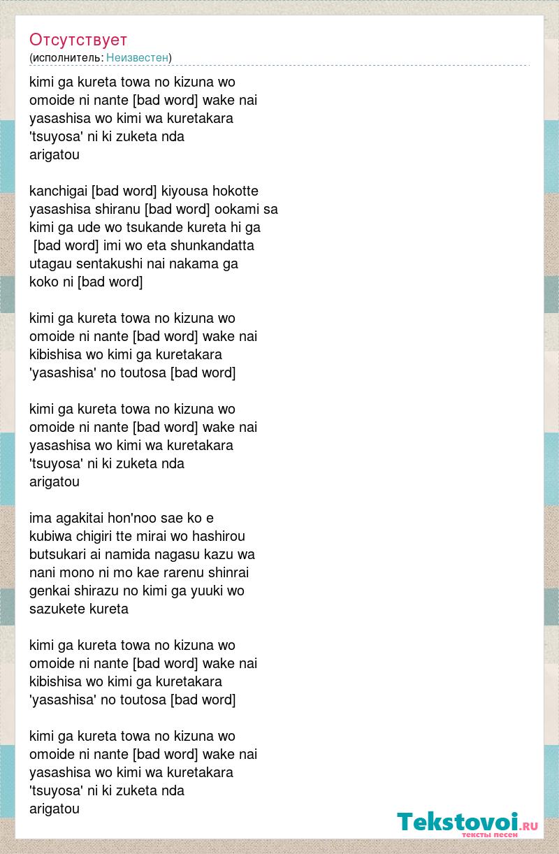 kimi ga kureta towa no kizuna wo omoide ni nante dekiru wake nai yasashisa wo kimi wa kuretakara 'tsuyosa' ni ki zuketa nda arigatou kanchigai [bad word] kiyousa hokotte yasashisa shiranu marude ookami sa kimi ga ude wo tsukande kureta hi ga ikiru imi wo eta shunkandatta utagau sentakushi nai nakama ga koko ni irukara kimi ga kureta towa no kizuna wo omoide ni nante dekiru wake nai kibishisa wo kimi ga kuretakara 'yasashisa' no toutosa [bad word] kimi ga kureta towa no kizuna wo omoide ni nante dekiru wake nai yasashisa wo kimi wa kuretakara 'tsuyosa' ni ki zuketa nda arigatou ima agakitai hon'noo sae ko e kubiwa chigiri tte mirai wo hashirou butsukari ai namida nagasu kazu wa nani mono ni mo kae rarenu shinrai genkai shirazu no kimi ga yuuki wo sazukete kureta kimi ga kureta towa no kizuna wo omoide ni nante dekiru wake nai kibishisa wo kimi ga kuretakara 'yasashisa' no toutosa [bad word] kimi ga kureta towa no kizuna wo omoide ni nante dekiru wake nai yasashisa wo kimi wa kuretakara 'tsuyosa' ni ki zuketa nda arigatou