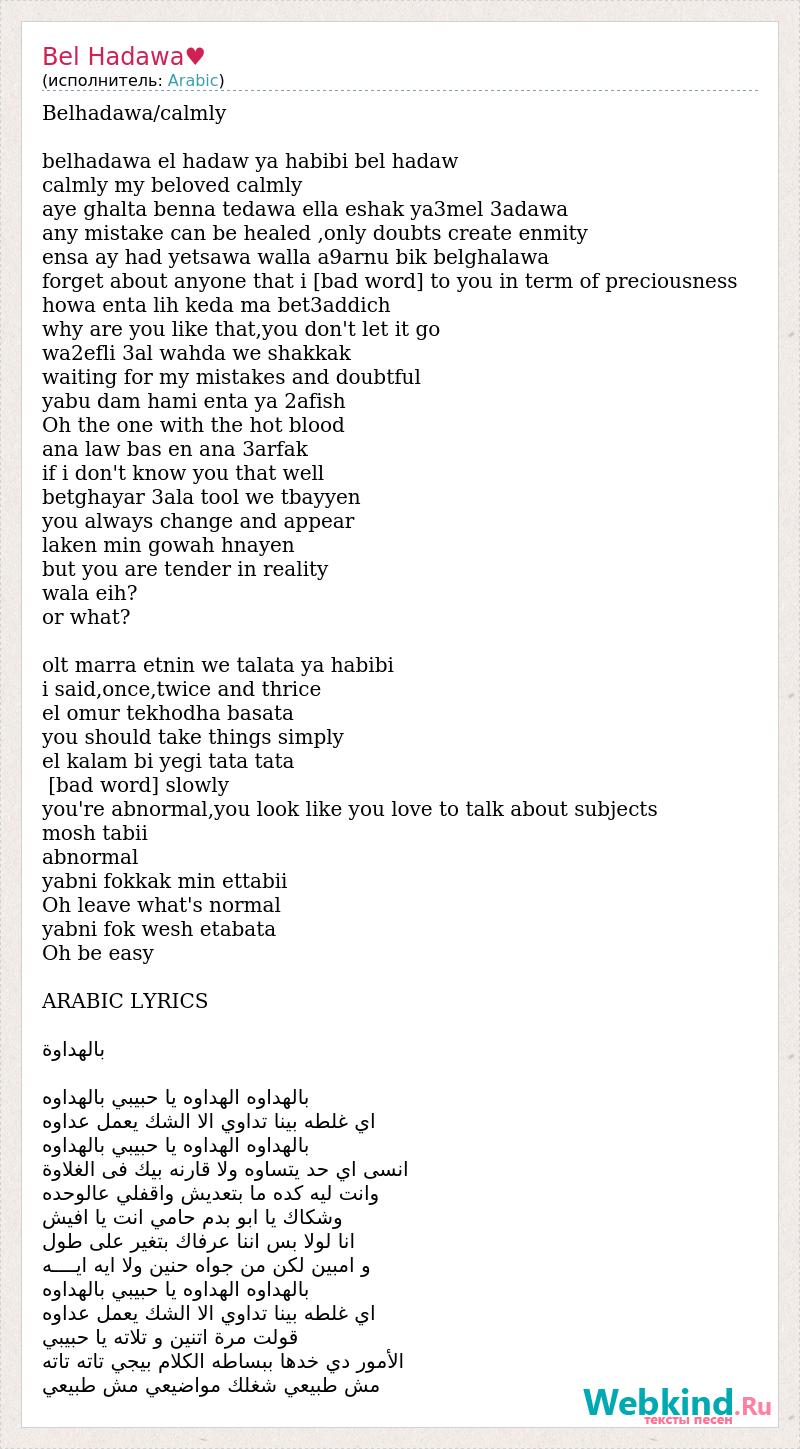Belhadawa/calmly belhadawa el hadaw ya habibi bel hadaw calmly my beloved calmly aye ghalta benna tedawa ella eshak ya3mel 3adawa any mistake can be healed ,only doubts create enmity ensa ay had yetsawa walla a9arnu bik belghalawa forget about anyone that i [bad word] to you in term of preciousness howa enta lih keda ma bet3addich why are you like that,you don't let it go wa2efli 3al wahda we shakkak waiting for my mistakes and doubtful yabu dam hami enta ya 2afish Oh the one with the hot blood ana law bas en ana 3arfak if i don't know you that well betghayar 3ala tool we tbayyen you always change and appear laken min gowah hnayen but you are tender in reality wala eih? or what? olt marra etnin we talata ya habibi i said,once,twice and thrice el omur tekhodha basata you should take things simply el kalam bi yegi tata tata [bad word] slowly you're abnormal,you look like you love to talk about subjects mosh tabii abnormal yabni fokkak min ettabii Oh leave what's normal yabni fok wesh etabata Oh be easy ARABIC LYRICS بالهداوة بالهداوه الهداوه يا حبيبي بالهداوه اي غلطه بينا تداوي الا الشك يعمل عداوه بالهداوه الهداوه يا حبيبي بالهداوه انسى اي حد يتساوه ولا قارنه بيك فى الغلاوة وانت ليه كده ما بتعديش واقفلي عالوحده وشكاك يا ابو بدم حامي انت يا افيش انا لولا بس اننا عرفاك بتغير على طول و امبين لكن من جواه حنين ولا ايه ايــــه بالهداوه الهداوه يا حبيبي بالهداوه اي غلطه بينا تداوي الا الشك يعمل عداوه قولت مرة اتنين و تلاته يا حبيبي الأمور دي خدها ببساطه الكلام بيجي تاته تاته مش طبيعي شغلك مواضيعي مش طبيعي